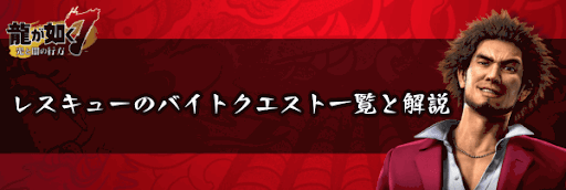 『龍が如く7』におけるレスキューのバイトクエストを一覧にして掲載!レスキューのバイトクエストの条件、報酬金、報酬アイテムを一覧にして掲載しているため、龍が如く7を攻略する際の参考にどうぞ。