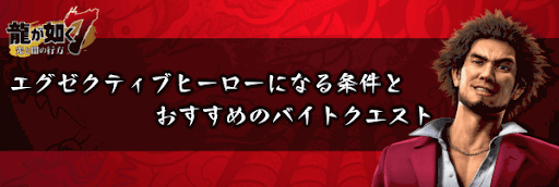 『龍が如く7』のエグゼクティブヒーローになる条件について掲載!バイトクエストの会員ランク「エグゼクティブヒーロー」になる条件とおすすめのバイトクエストも掲載しているため、龍が如く7を攻略する際の参考にどうぞ。
