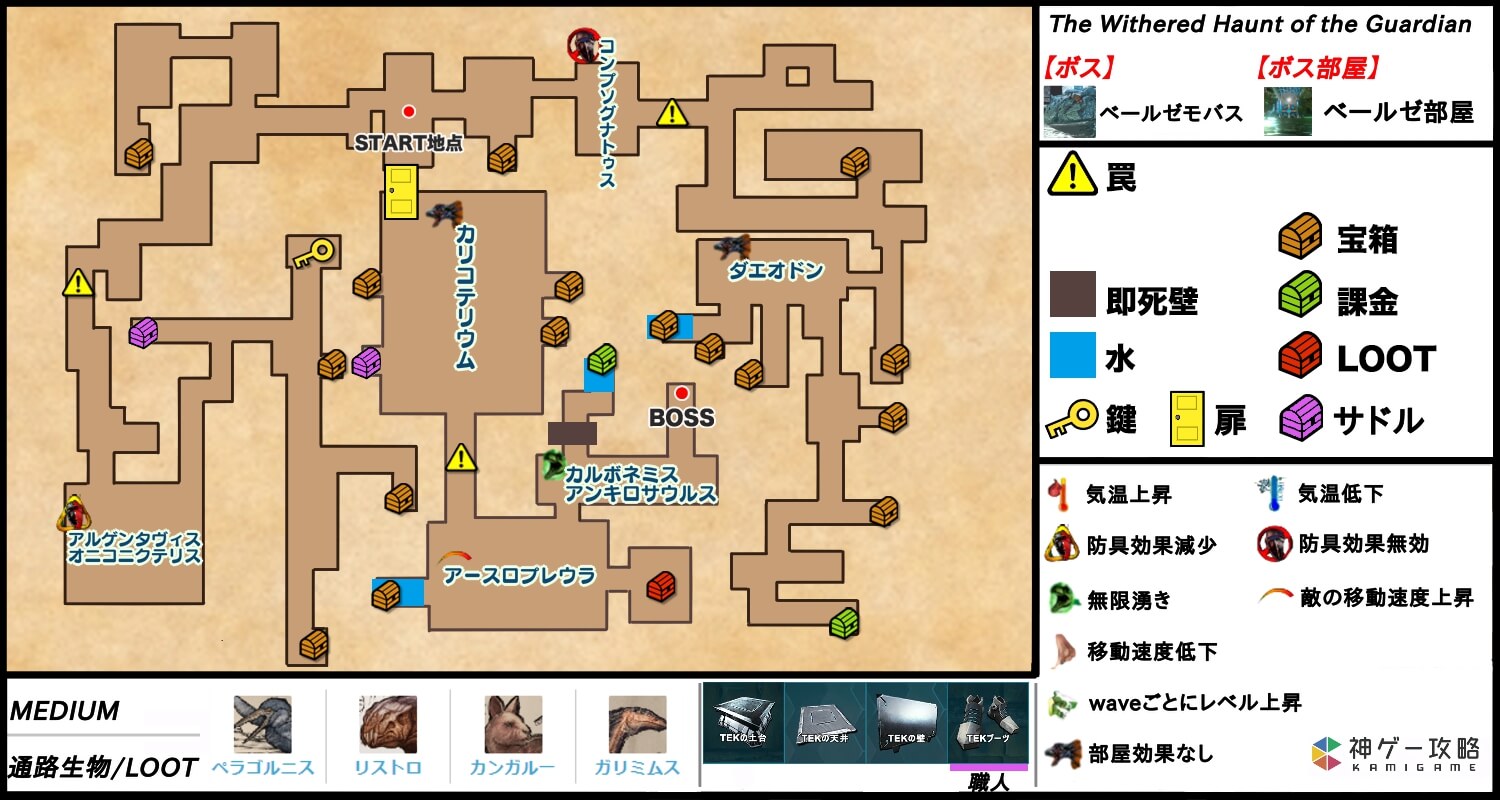 ARKモバイル(ARK:Survival Evolved)のダンジョン「Withered Haunt of the Guardian」について紹介。ダンジョンのクリア動画や攻略ルート、宝箱の位置を掲載しているため、ダンジョン攻略の参考にどうぞ!