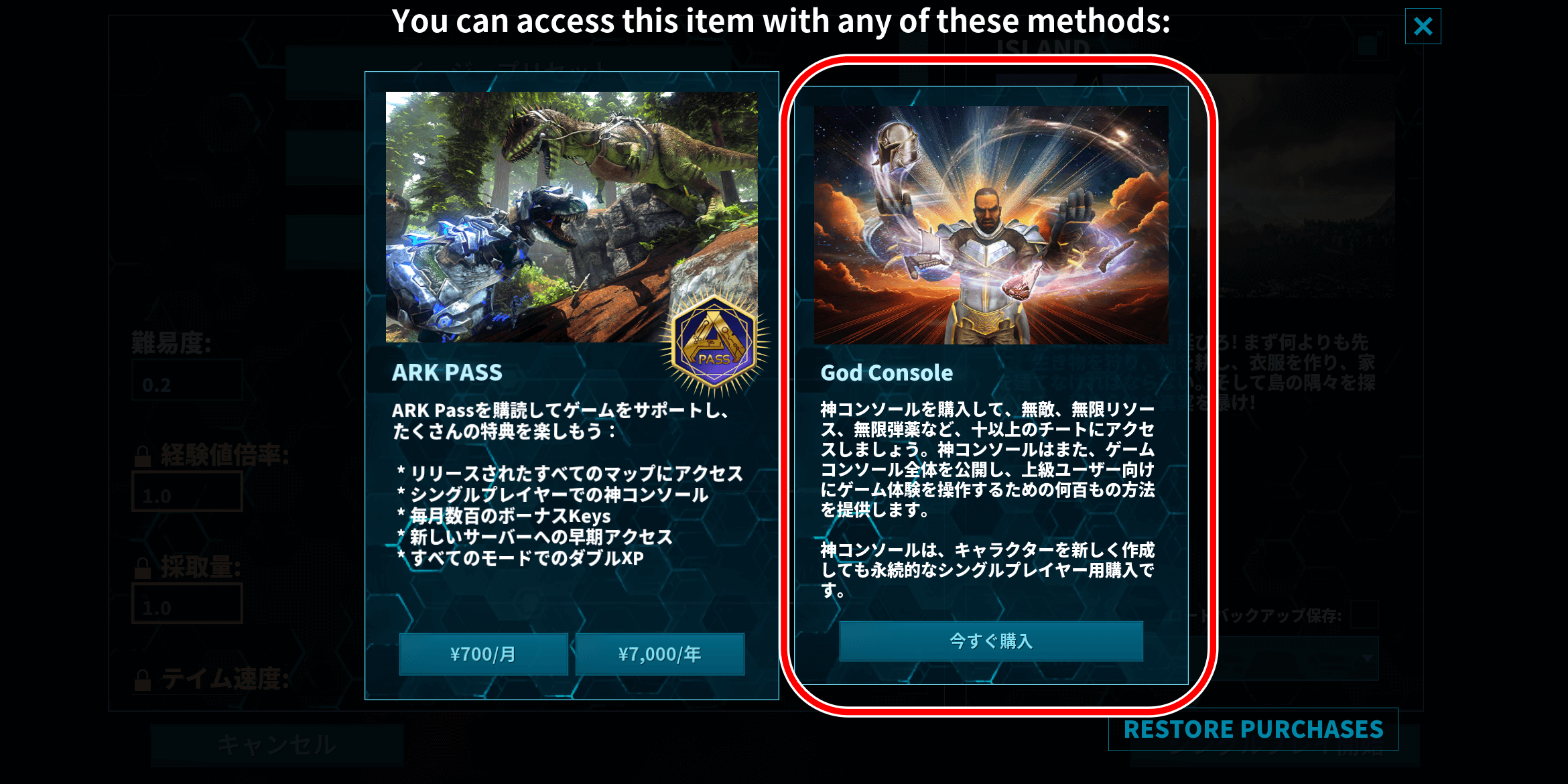 テイム速度やブリーディング速度、採取量などの重要な設定に加えて、コマンド入力をするには神コンソールの購入が必要だ。神コンソールが無いと、重要設定やコマンドの使用ができない。使いたい場合は、神コンソール単体購入か、課金パスを購入しよう。