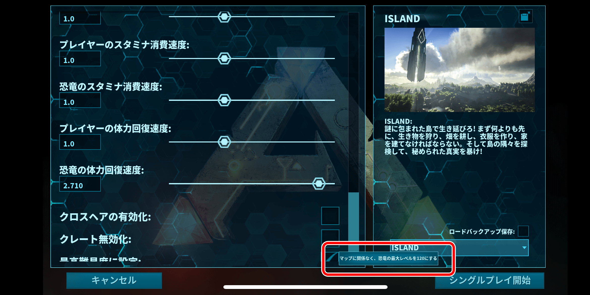ARKモバイル2では、野生生物の最大レベルは120の可能性が高い。サーバー設定時に「最高難易度に設定」の項目をONにすると、野生生物のレベルが120で生成されるのが根拠だ。