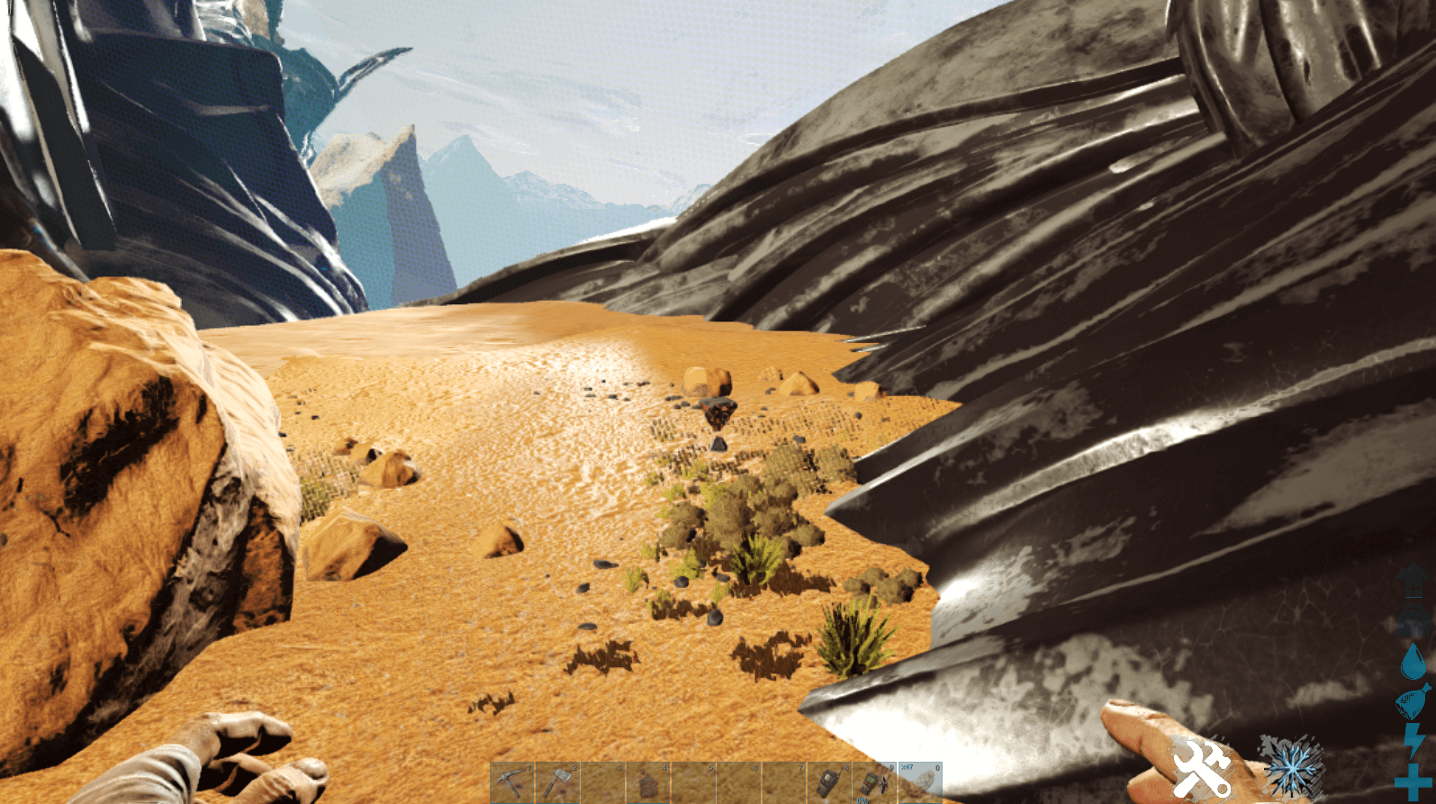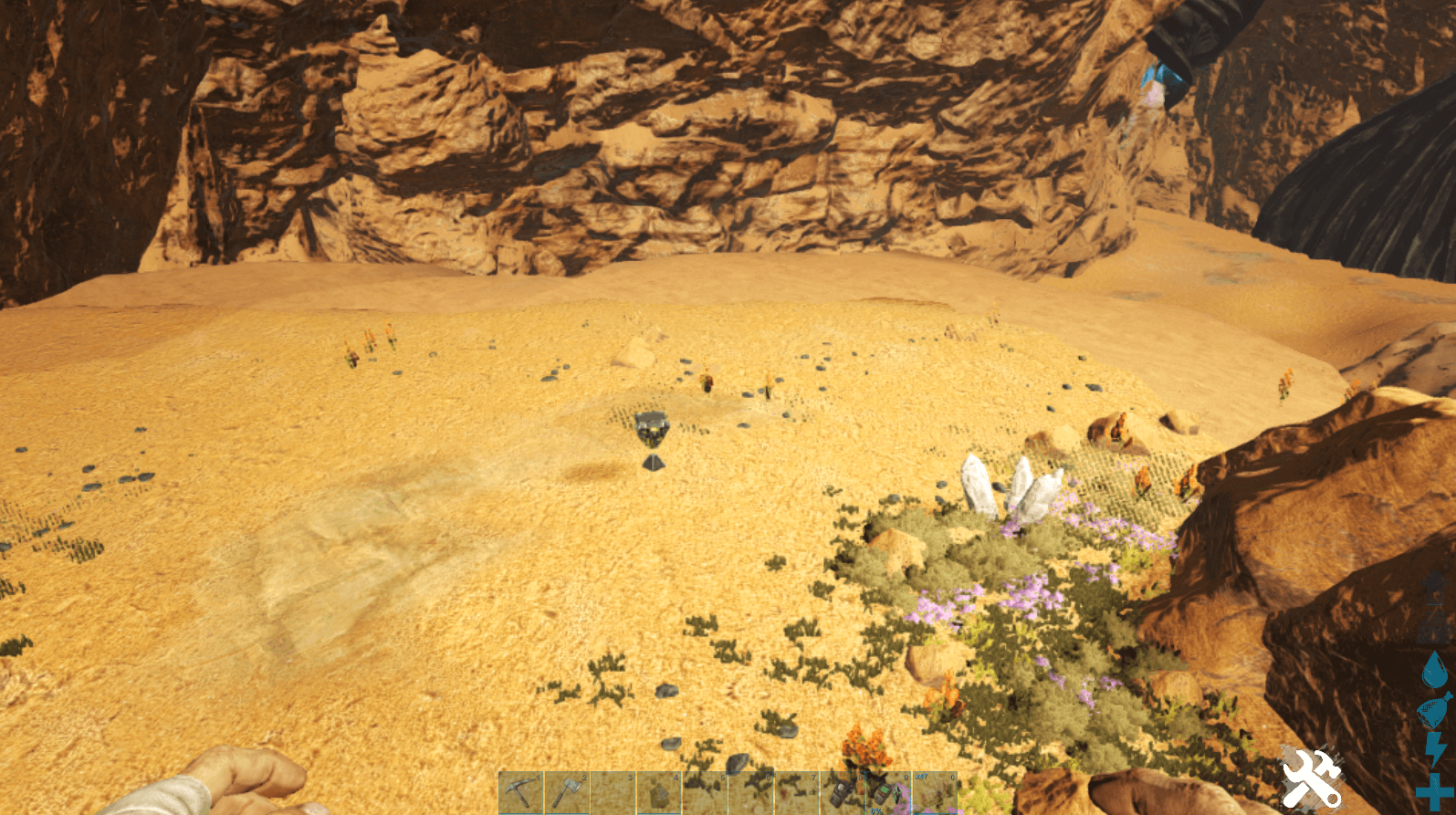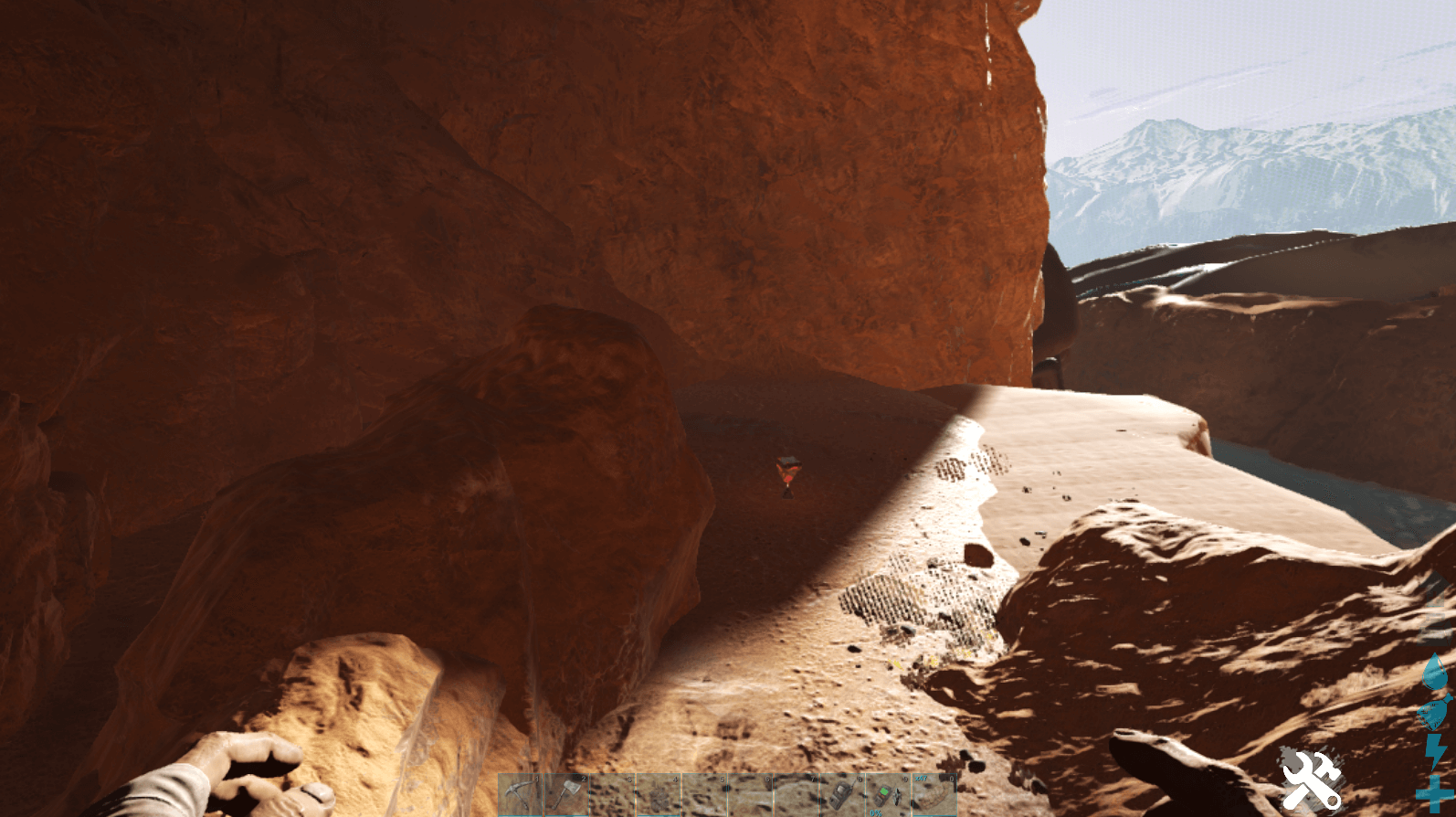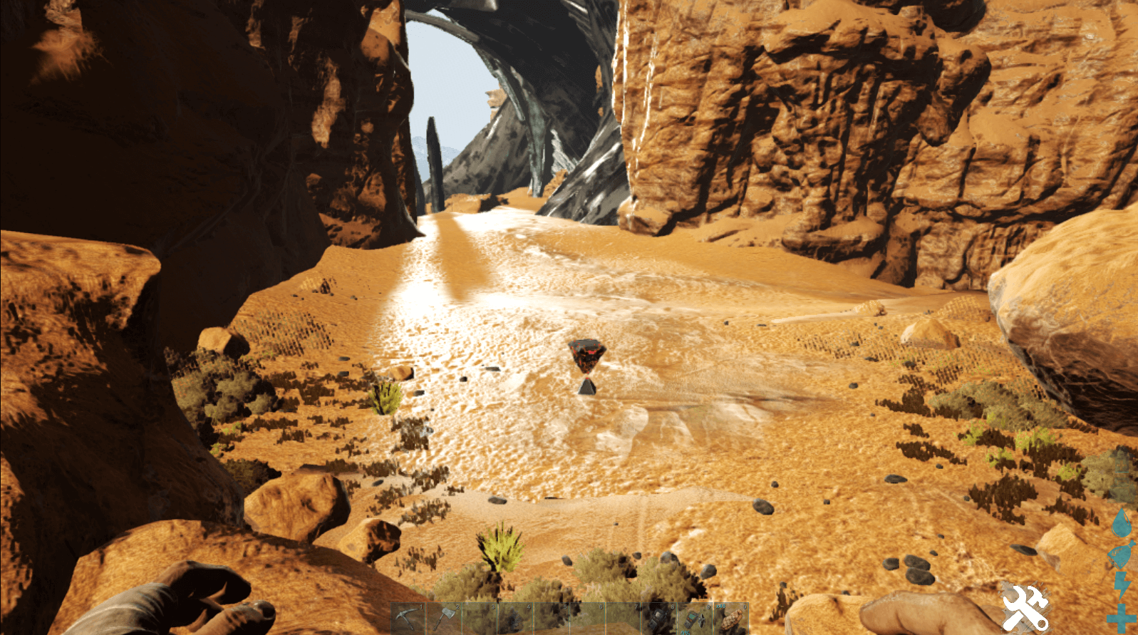 引き続き、次の水辺までひたすら道なりに進もう。水中にはメガピラニアがいるため、水分補給をしに降りてはいけない。必ずギガノトやカルカロで討伐したのちに、水分を補給しよう。