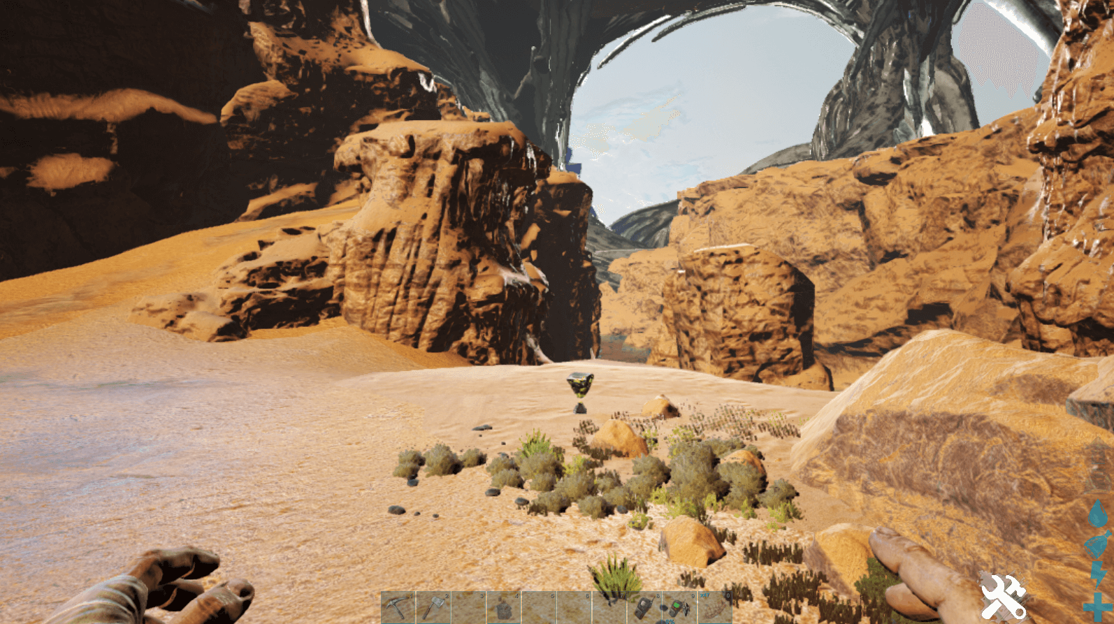 デザート・タイタンに挑戦する場合は、引き続き道なりに進んでターミナルまで移動しよう。デザート・タイタンを召喚するには、戦利品アイテムや混沌のアーティファクトを捧げる必要がある。