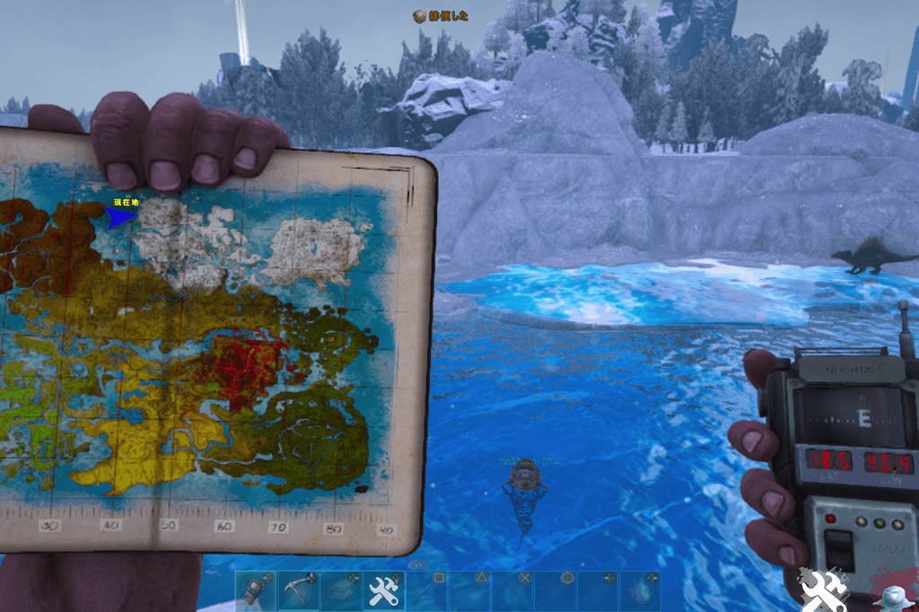 | 1 | 飛行生物で「18.8:40.8」付近へ移動し、バシロサウルスに乗り換えてから入り口を目指す。 |