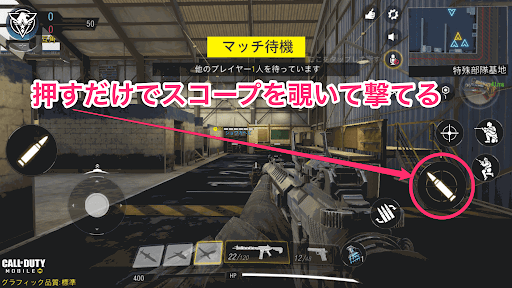 ただし、近距離にいる敵に対して攻撃する場合のみ、ワンタップエイムによる射撃よりも腰だめ撃ちの方が対応しやすい。敵が近くにいる場合は、画面反対側の「射撃」ボタンを押して腰だめ撃ちを行うと、有利に立ち回れる。