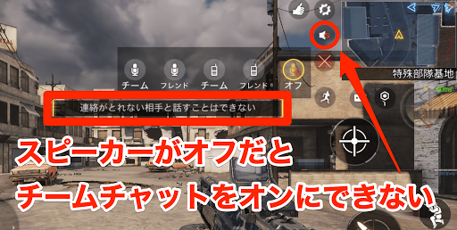 スピーカーがオフの状態でマイクをオンにしようとすると「フレンド」しか選択できず、「フレンド」をオンにすると自動的にスピーカーも「フレンド」でオンになる。「チーム」でボイスチャットしたい場合は、スピーカーも「チーム」でオンにしておこう。