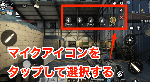 また、マイクをオンにする際は「フレンド」と「チーム」から、声の届く範囲を選択できる。フレンドとだけボイスチャットをしたい場合は「フレンド」を、チームでチャットをしたい場合は「チーム」を選択しよう。