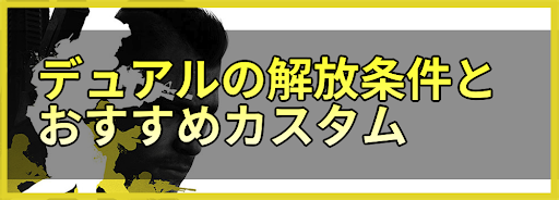 デュアルとは、両手に武器を持つ二丁拳銃のこと。デュアルを使用すると、射程が限られ腰撃ちしか出来なくなるが、火力と総合的なレートが上昇する。さらに、覗き込むエイム動作が無くなるため、近距離戦闘において非常に有効なカスタムだ。