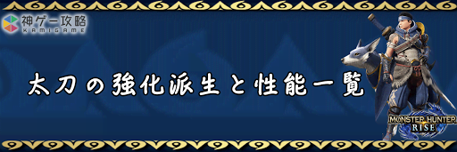 モンハンライズ(MHRise)の武器「太刀」の強化派生について紹介。各武器の派生や最大強化時の性能を掲載しているので、モンハンライズ攻略の参考にどうぞ。