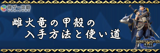 モンハンライズ(MHRise)のアイテム「雌火竜の甲殻」の入手方法と使い道を掲載。雌火竜の甲殻を使用する装備や装飾品の一覧も掲載しているので、モンハンライズを攻略する際の参考にどうぞ!