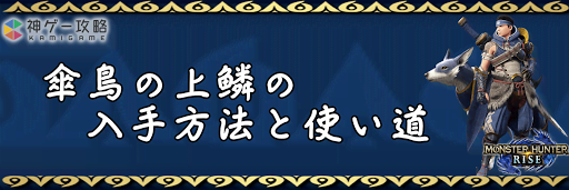 モンハンライズ(MHRise)のアイテム「傘鳥の上鱗」の入手方法と使い道を掲載。傘鳥の上鱗を使用する装備や装飾品の一覧も掲載しているので、モンハンライズを攻略する際の参考にどうぞ!