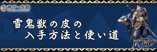 モンハンライズ(MHRise)のアイテム「雪鬼獣の皮」の入手方法と使い道を掲載。雪鬼獣の皮を使用する装備や装飾品の一覧も掲載しているので、モンハンライズを攻略する際の参考にどうぞ!