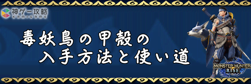 モンハンライズ(MHRise)のアイテム「毒妖鳥の甲殻」の入手方法と使い道を掲載。毒妖鳥の甲殻を使用する装備や装飾品の一覧も掲載しているので、モンハンライズを攻略する際の参考にどうぞ!