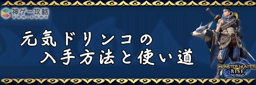 モンハンライズ(MHRise)のアイテム「元気ドリンコ」の入手方法と使い道を掲載。元気ドリンコを使用する装備や装飾品の一覧も掲載しているので、モンハンライズを攻略する際の参考にどうぞ!