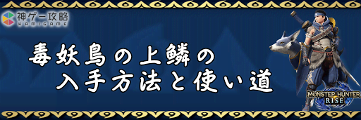 モンハンライズ(MHRise)のアイテム「毒妖鳥の上鱗」の入手方法と使い道を掲載。毒妖鳥の上鱗を使用する装備や装飾品の一覧も掲載しているので、モンハンライズを攻略する際の参考にどうぞ!