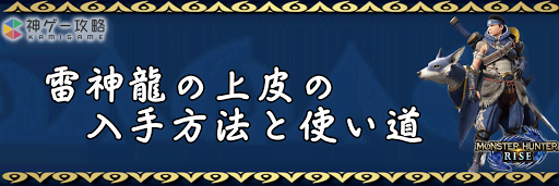 モンハンライズ(MHRise)のアイテム「雷神龍の上皮」の入手方法と使い道を掲載。雷神龍の上皮を使用する装備や装飾品の一覧も掲載しているので、モンハンライズを攻略する際の参考にどうぞ!