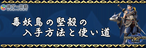 モンハンライズ(MHRise)のアイテム「毒妖鳥の堅殻」の入手方法と使い道を掲載。毒妖鳥の堅殻を使用する装備や装飾品の一覧も掲載しているので、モンハンライズを攻略する際の参考にどうぞ!