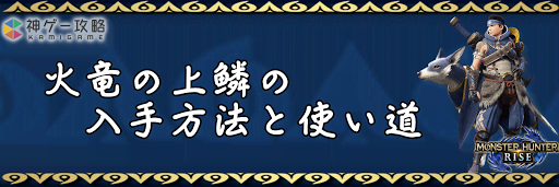 モンハンライズ(MHRise)のアイテム「火竜の上鱗」の入手方法と使い道を掲載。火竜の上鱗を使用する装備や装飾品の一覧も掲載しているので、モンハンライズを攻略する際の参考にどうぞ!