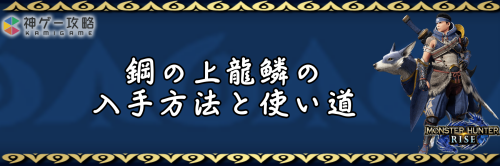 モンハンライズ(MHRise)のアイテム「鋼の上龍鱗」の入手方法と使い道を掲載。鋼の上龍鱗を使用する装備や装飾品の一覧も掲載しているので、モンハンライズを攻略する際の参考にどうぞ!