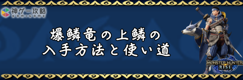 モンハンライズ(MHRise)のアイテム「爆鱗竜の上鱗」の入手方法と使い道を掲載。爆鱗竜の上鱗を使用する装備や装飾品の一覧も掲載しているので、モンハンライズを攻略する際の参考にどうぞ!