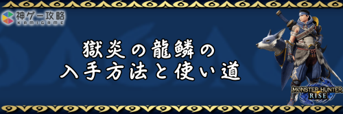 モンハンライズ(MHRise)のアイテム「獄炎の龍鱗」の入手方法と使い道を掲載。獄炎の龍鱗を使用する装備や装飾品の一覧も掲載しているので、モンハンライズを攻略する際の参考にどうぞ!