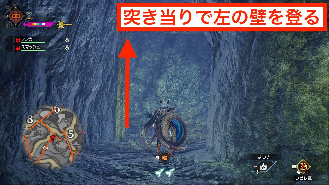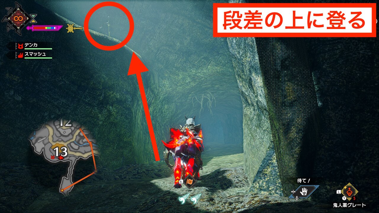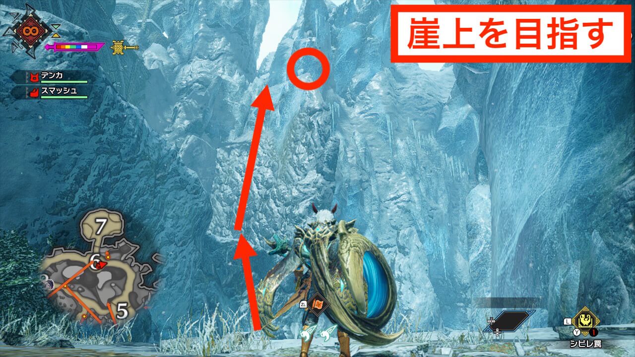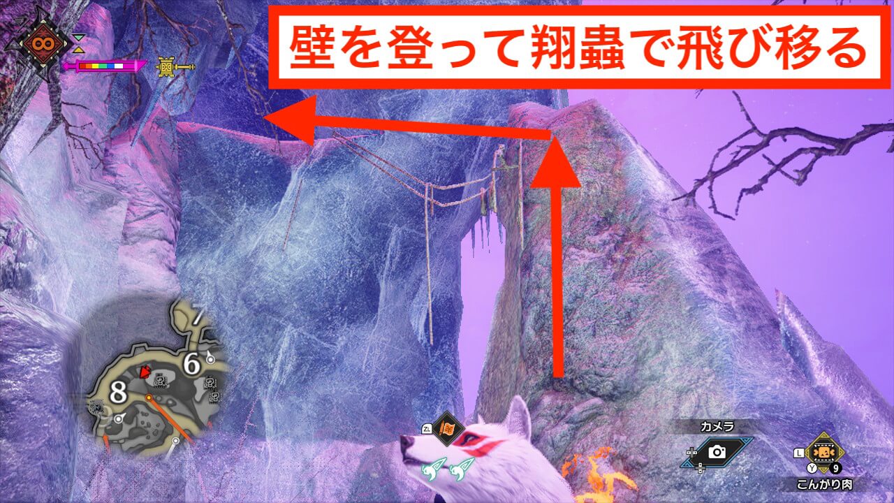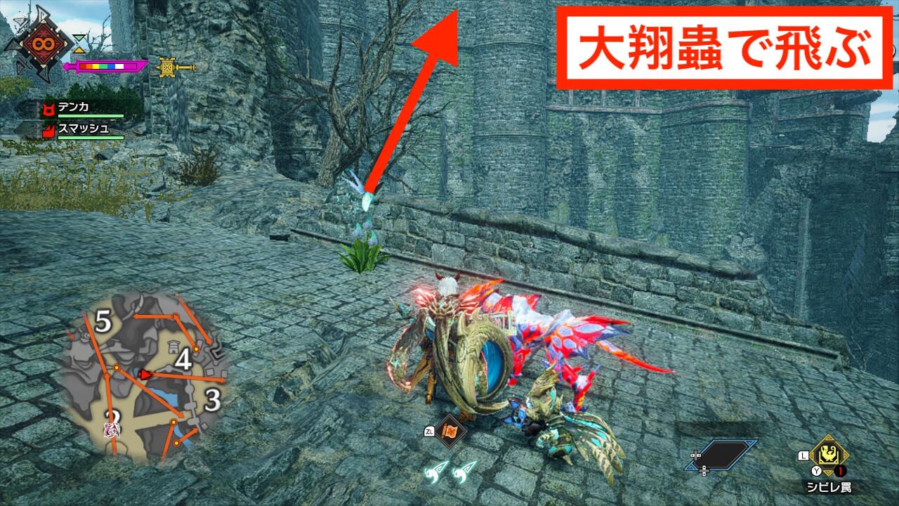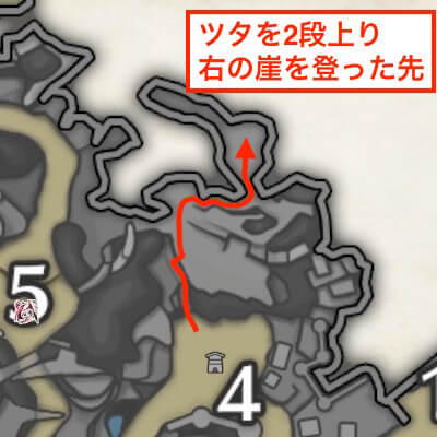 手記5はエリア6の東に繋がる通路の左側にある崖の上にある。翔蟲が翔蟲と壁走りを両方使うため、スタミナゲージは多めに確保しておきたい。