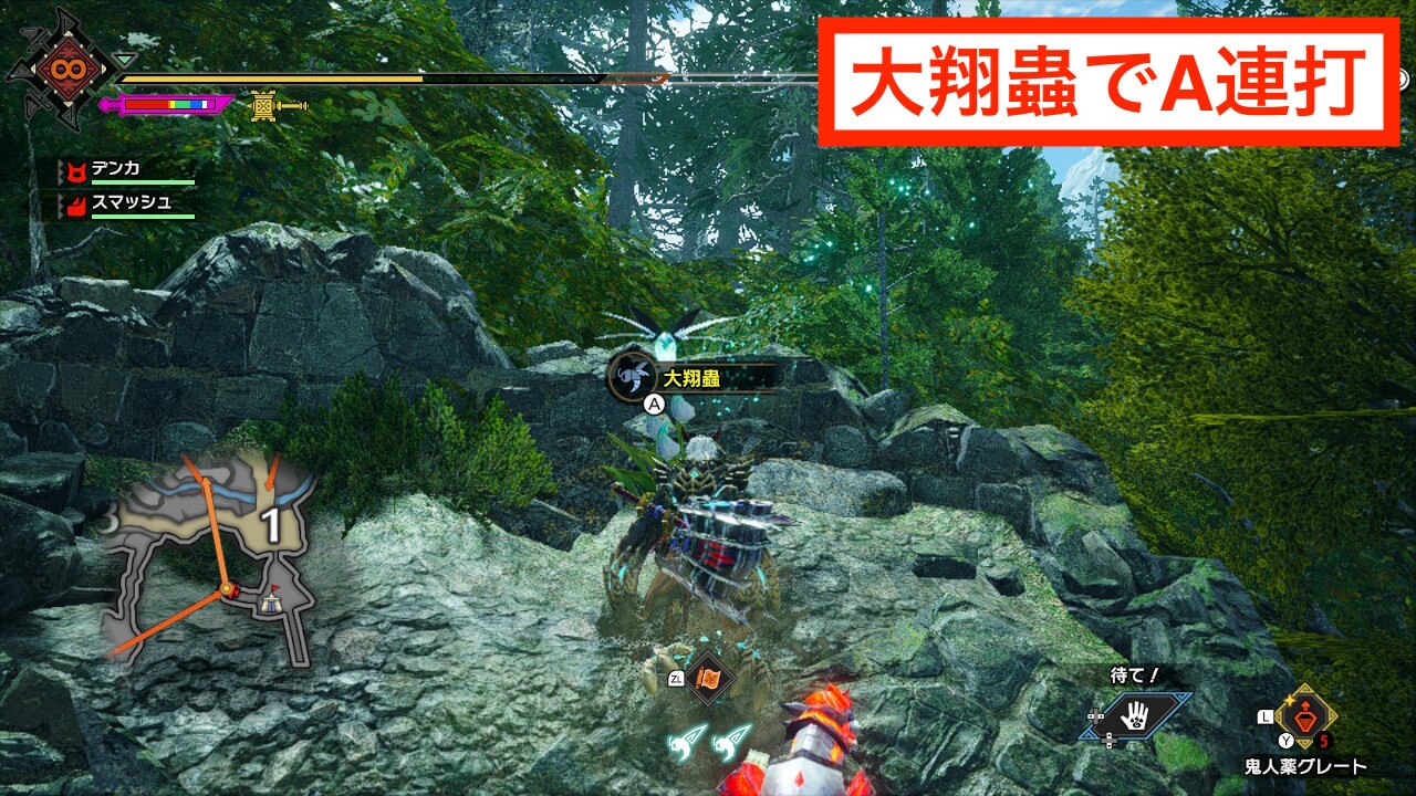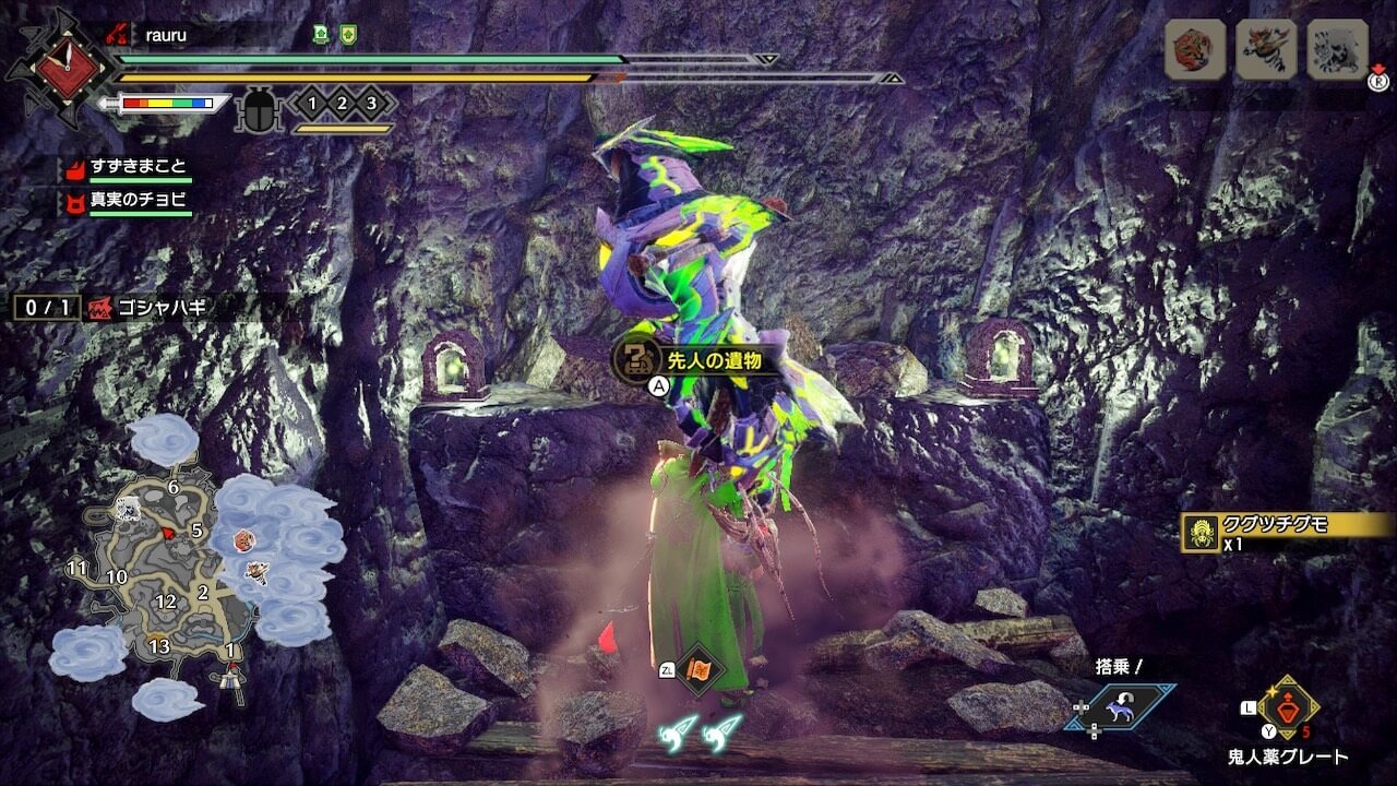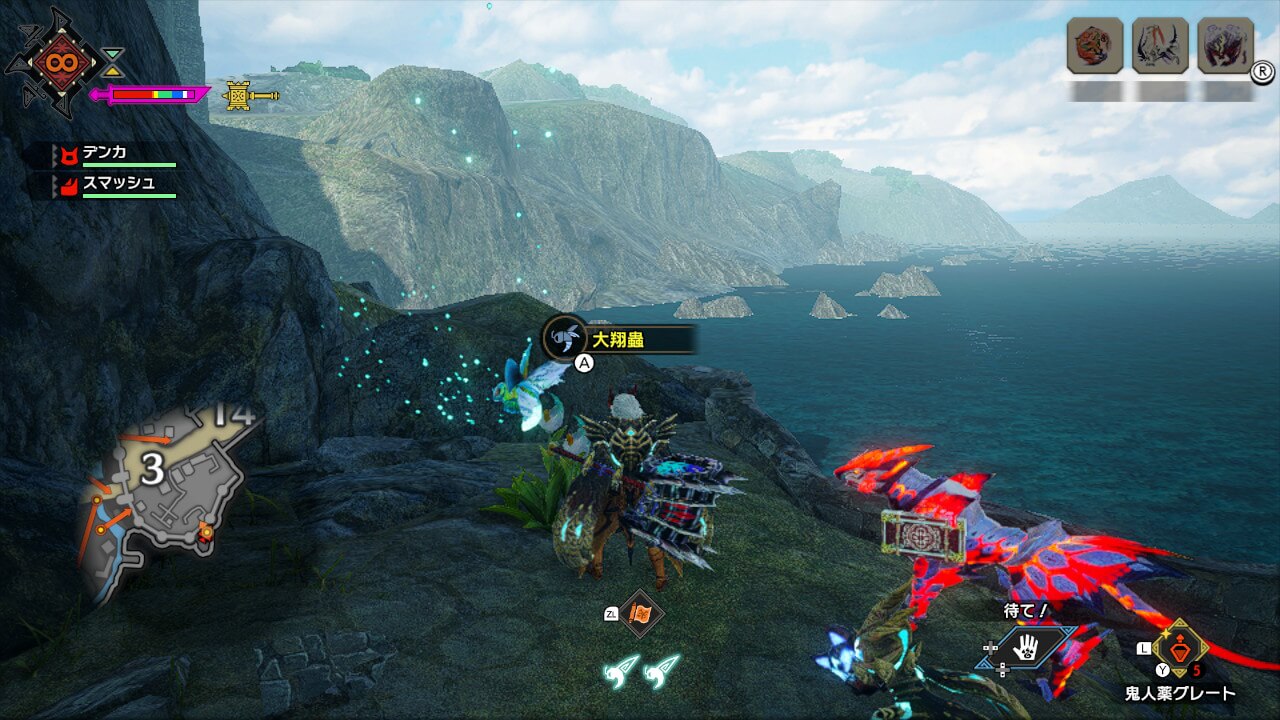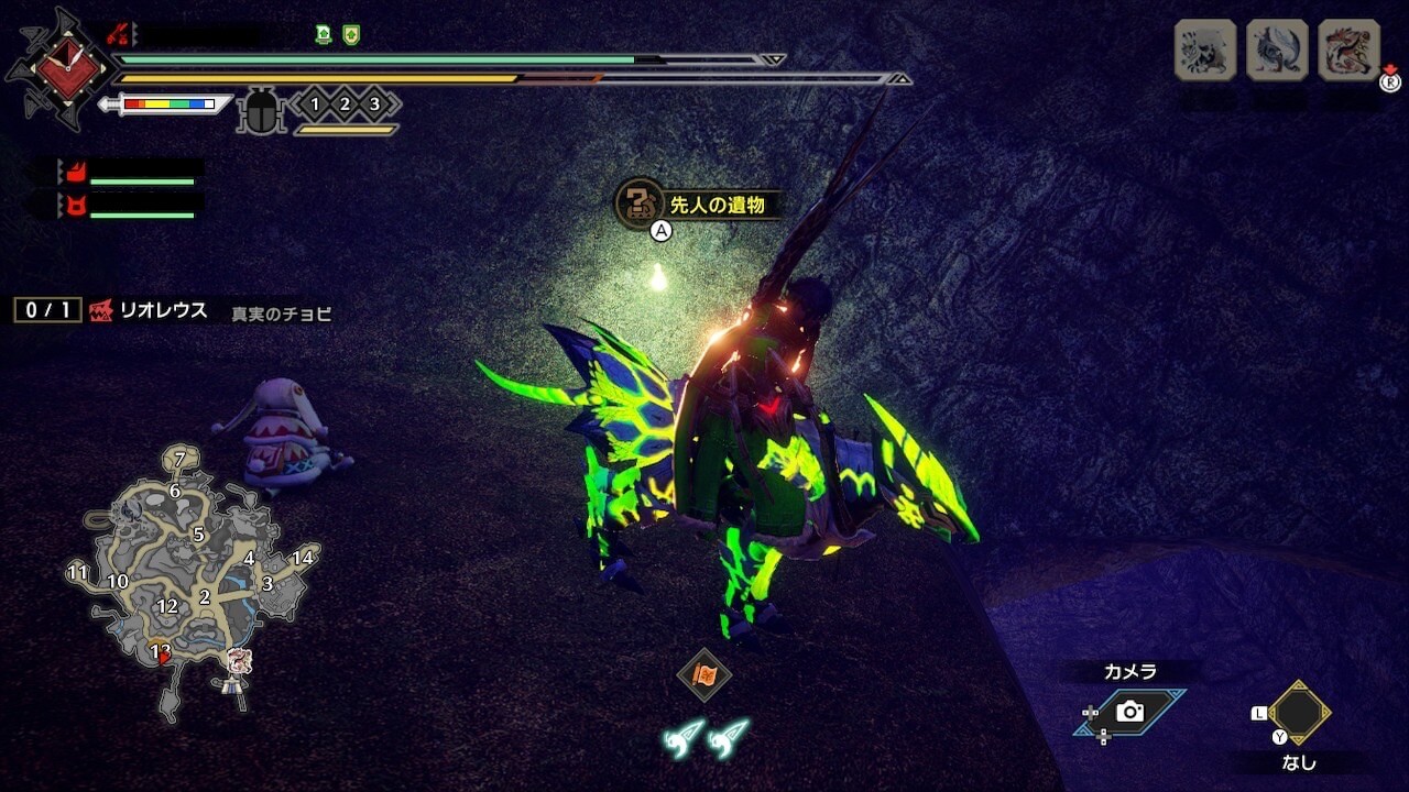 オルギィはエリア1の西、エリア3、エリア8、エリア8と10の間、エリア10の5箇所に生息している。エリア8〜10に行いきオルギィを狩れば8頭一気に討伐可能だ。