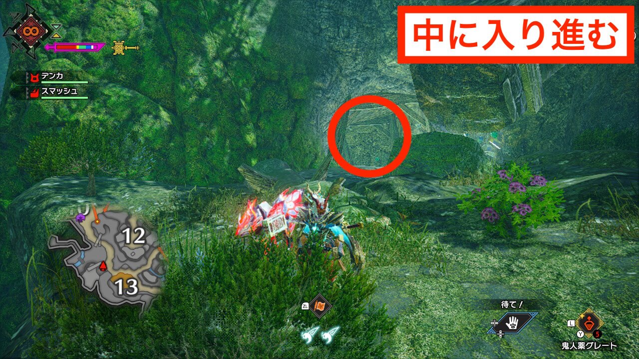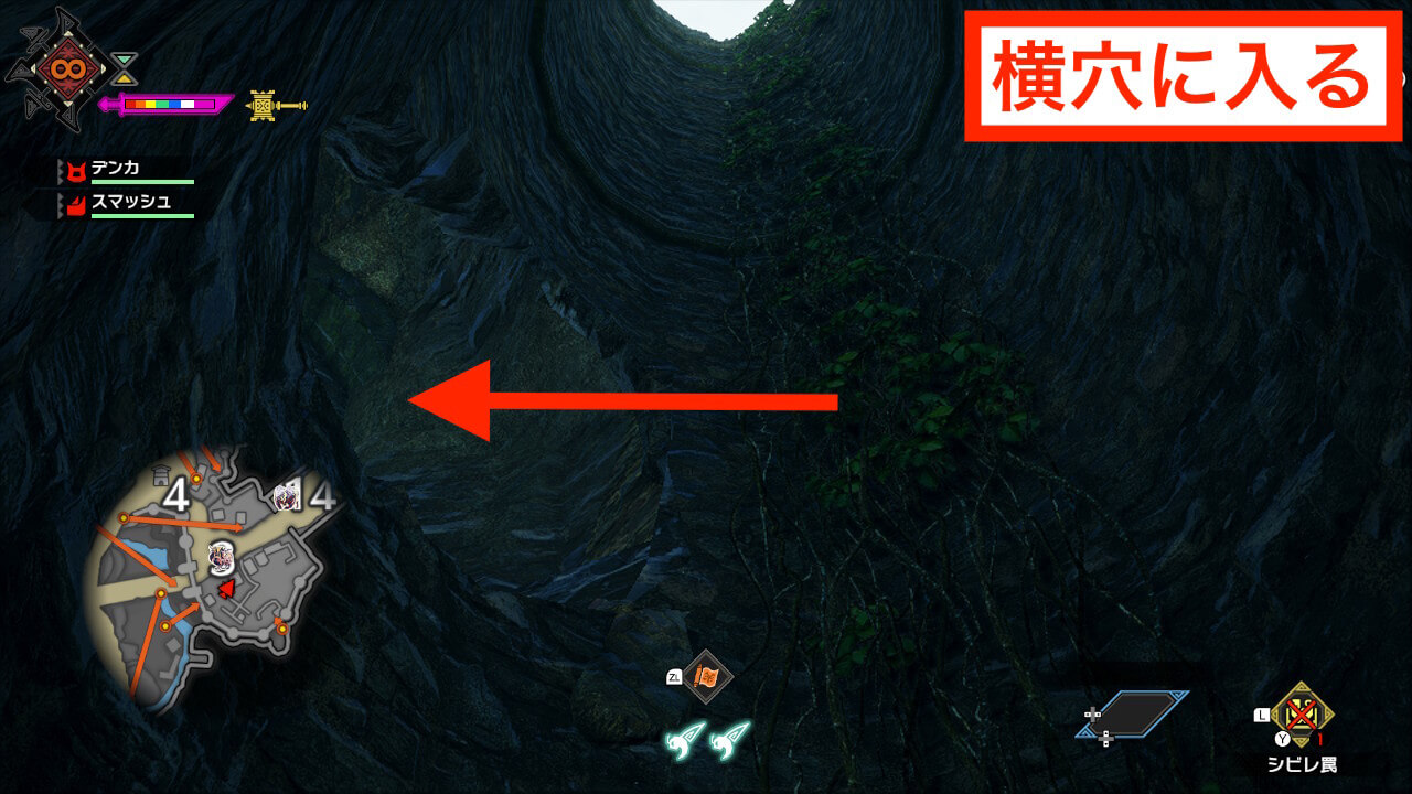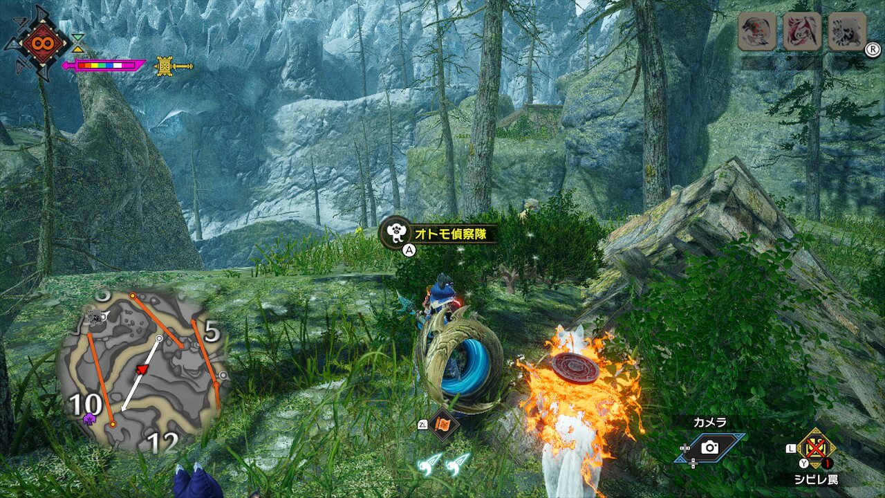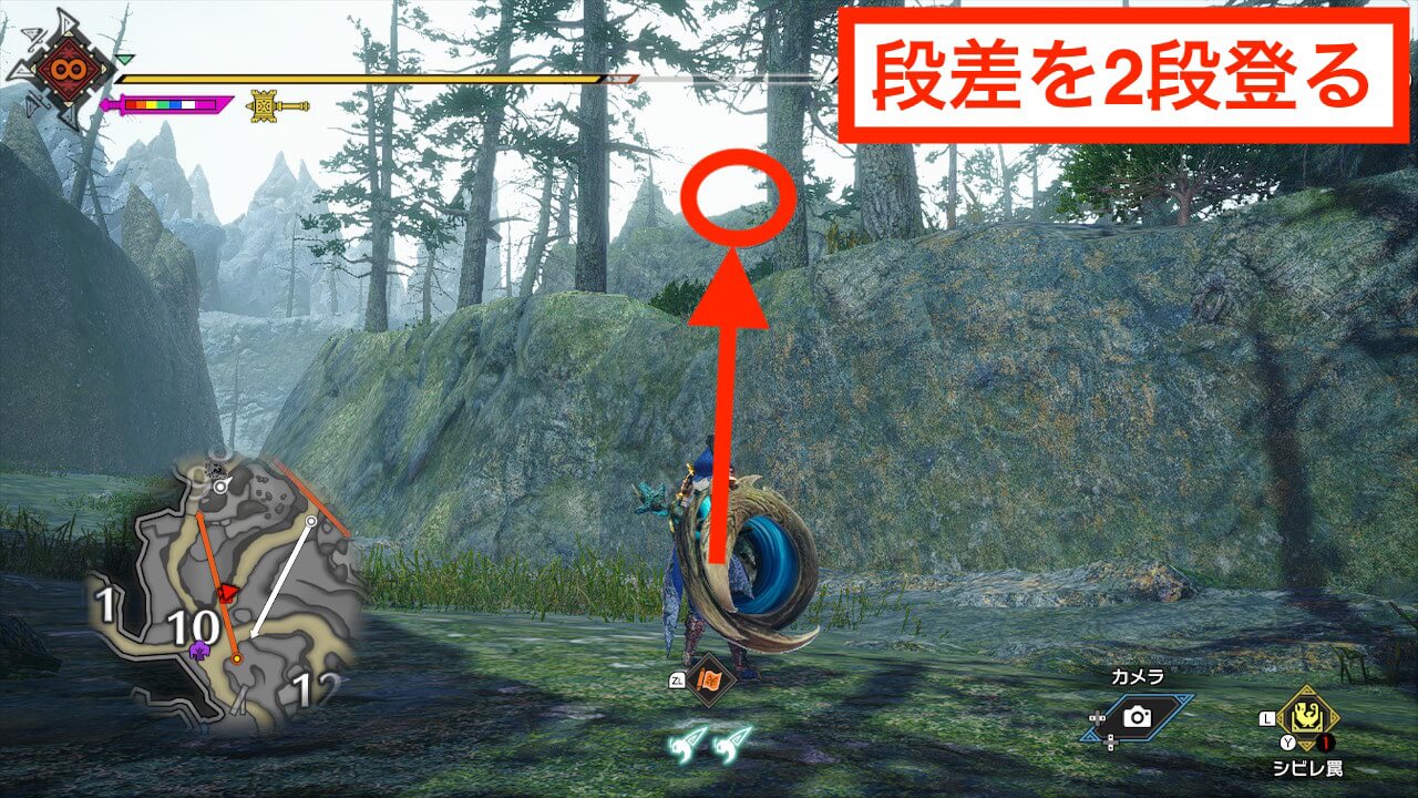 城塞高地のサブキャンプはエリア4の崖を登った先に存在する。ツタを2段登った先の細道で右側の崖を登って奥に行けばサブキャンプにたどり着ける。