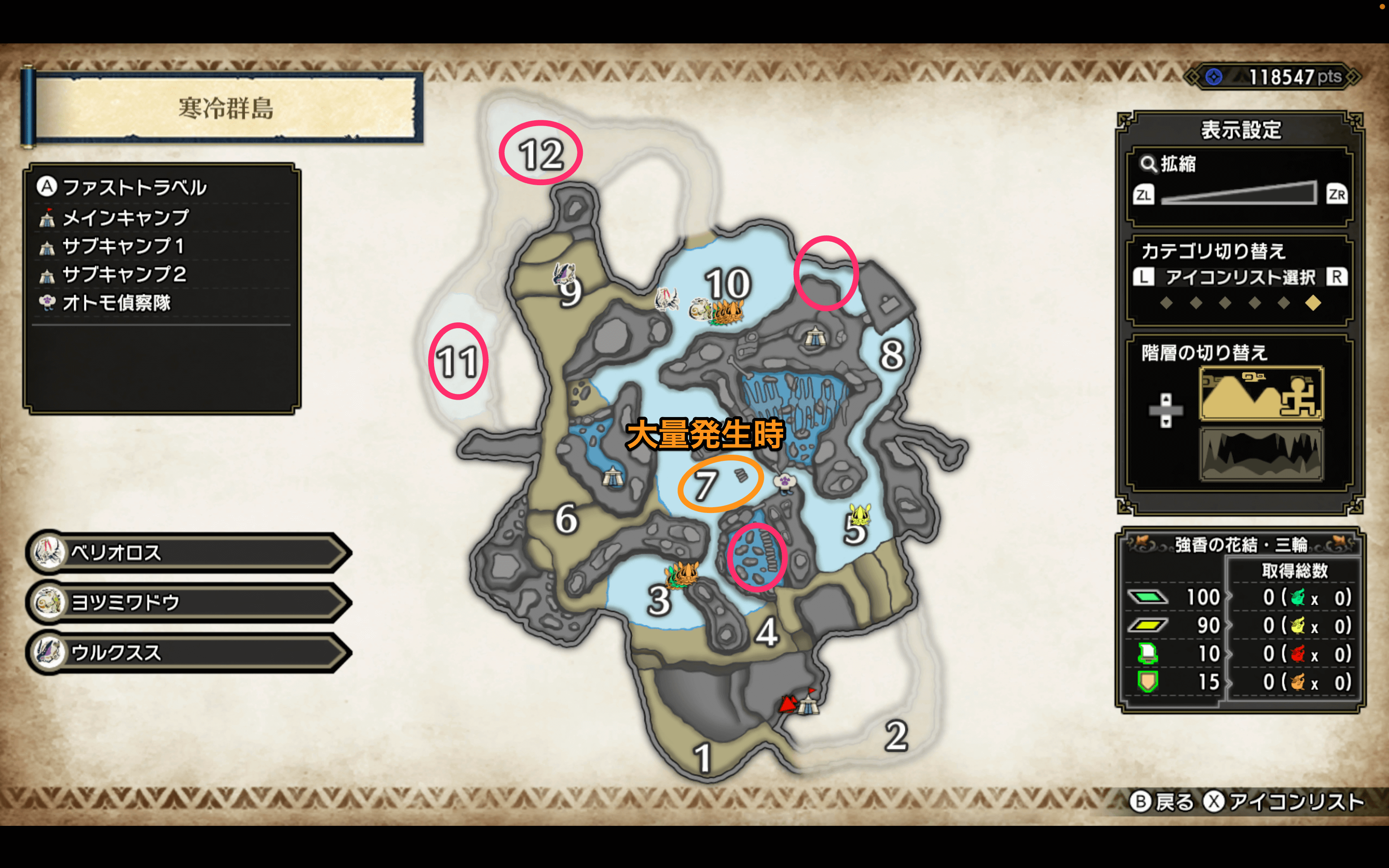 | 寒冷群島のマップと入手できる素材一覧 |