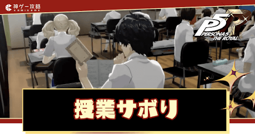 ペルソナ5 ザ・ロイヤル(P5R)のサブイベント「授業サボり」について掲載。授業サボりをする方法やサボりのできる日、サボタージュでできる行動と効果についても紹介。ペルソナ5R攻略の参考にどうぞ。