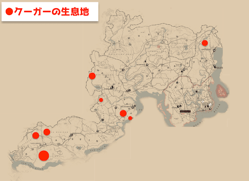 RDR2(レッドデッドリデンプション2)のクーガーの生息場所を掲載。クーガーの素材を最良で入手するための狩猟方法や、手順も解説しているため、攻略の参考にしてほしい。