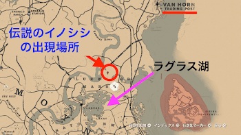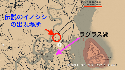 伝説のイノシシは、マップ東にあるラグラスの北にいる。地図にある「BLUE WATER」の「A」の上付近が縄張りなので、馬で移動しよう。