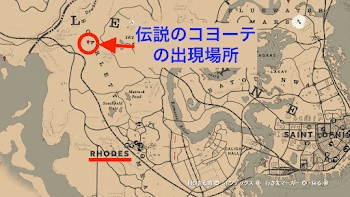 伝説のコヨーテは、ローズの街から北西にある牧草地にいる。地図で「SCARET」と書かれた場所の「A」付近が縄張りなので、馬で移動しよう。