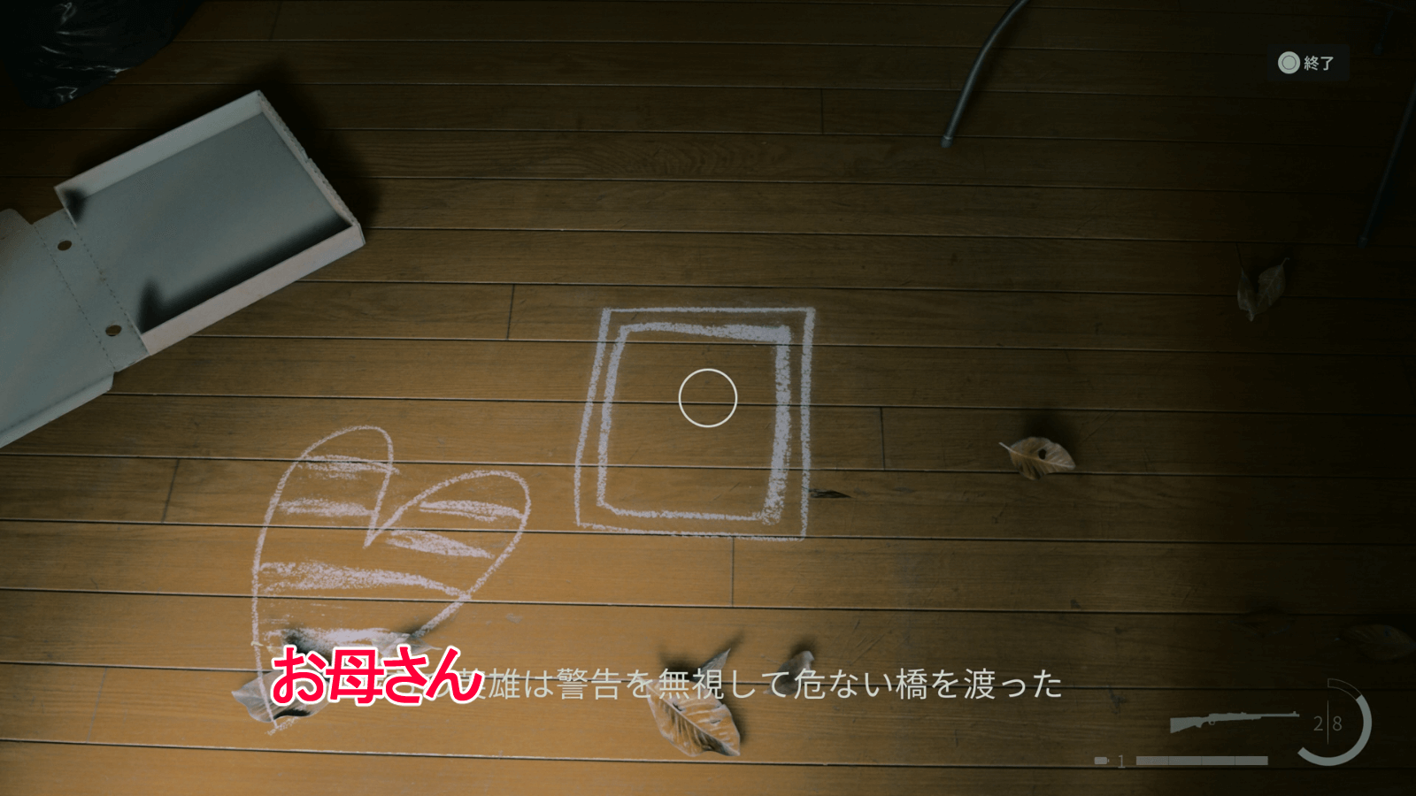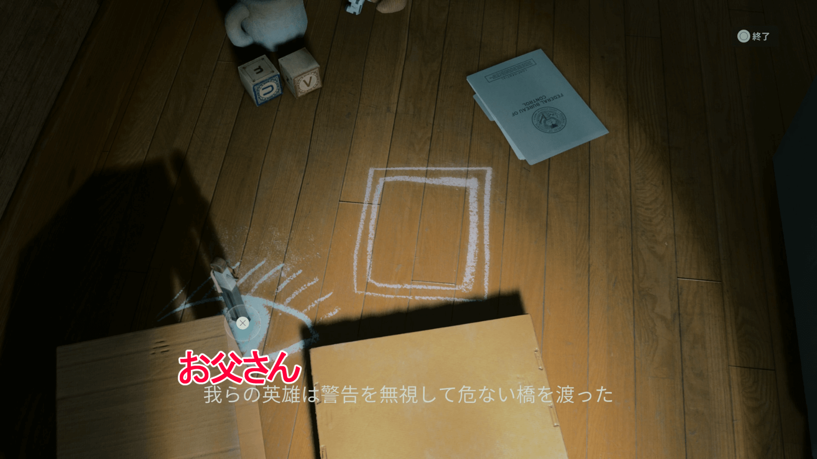 人形を設置したら、1階のトランシーバーへ移動しよう。トランシーバーを☓ボタンで調べると、エコーのような歪みが発生するため、ライトを当てて焼き払うと良い。焼き払った跡にトランシーバーの前に箱が出現し、箱を取るとチャームの装備数が1枠増えている。