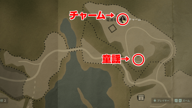 報酬であるシカのチャームは、童謡パズルからマップで見て上方向にある、シカの死体付近に落ちている。やや離れた位置にノーヒントで落ちているため、地図と電波塔を目印に探して回収しよう。