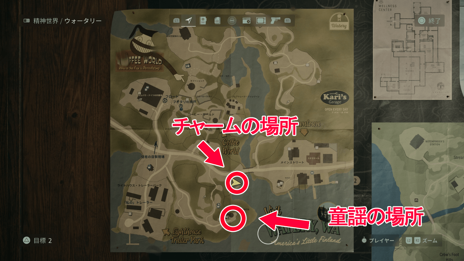 ウィッチファインダーステーションの童謡は、左下の船にヒーローの人形、右下の木にオオカミの人形を置くとクリア。パズルに必要な人形は、建物の2階で入手できる。また、クリア後は建物2階にコーヒーマグのチャームが出現するため、必ず回収しておこう。