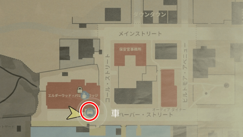 コスケラ兄弟からスペアキーの情報を得たら、兄弟の後ろに続く舗装されていない道を通り、コーヒーショップを目指そう。道中は暗く、敵が出現するため、物資が不足している場合は町を探索して弾薬や回復アイテムを集めておくと良い。
