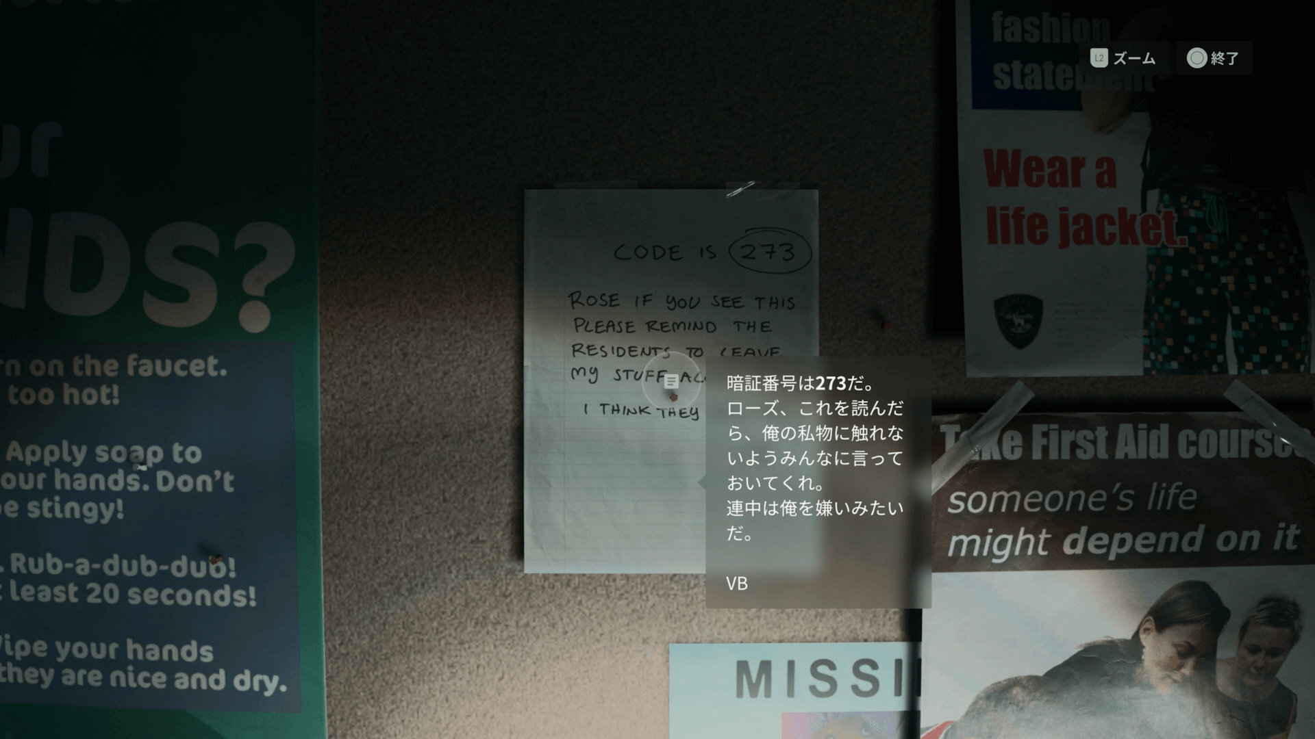 ヒューズの場所 ロック解除用メモ 暗証番号 273 地下室の発電機に電力を復旧させるには、電力源となるヒューズが必要だ。ヒューズはダイヤル錠のついた赤い箱に入っているため、洗濯機の近くメモからロックを解除して入手しよう。ヒューズを挿し込むと、発電機周辺及び屋敷3階の電力が復旧する。