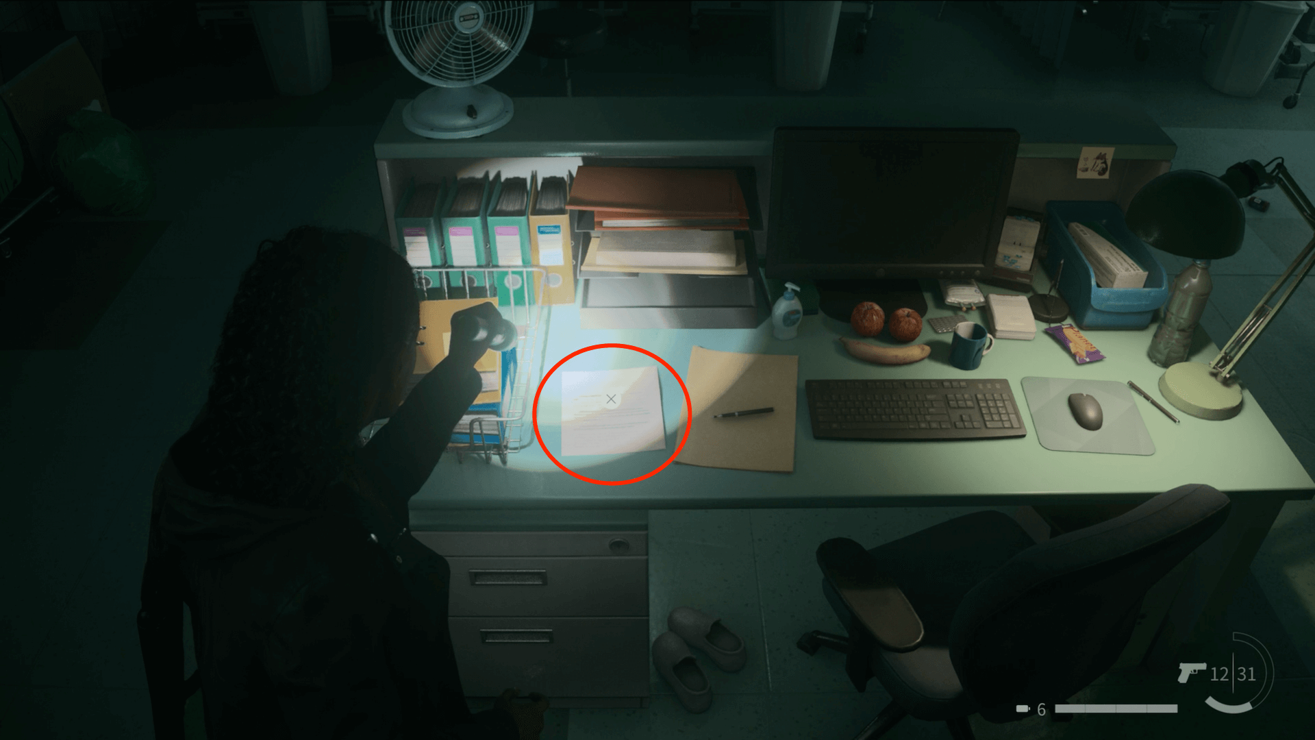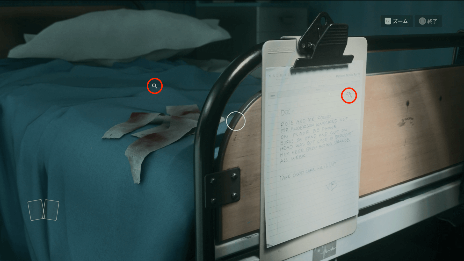 手がかり 原稿 健康センターの病室では、奥のベッドから手がかり2つと机から原稿を入手可能だ。病室内は暗いため、ライトで照らしながら探してみよう。