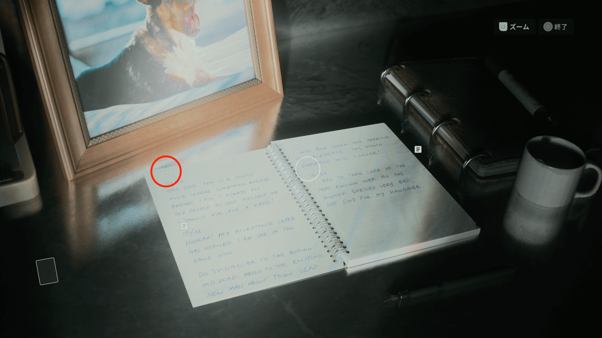 手に入れたドアノブを使い、入れなかった作業場に入ろう。作業場では、原稿と狩猟ライフルを入手可能だ。なお、インベントリが満杯の場合は、休憩の靴箱でアイテムを整理すると良い。