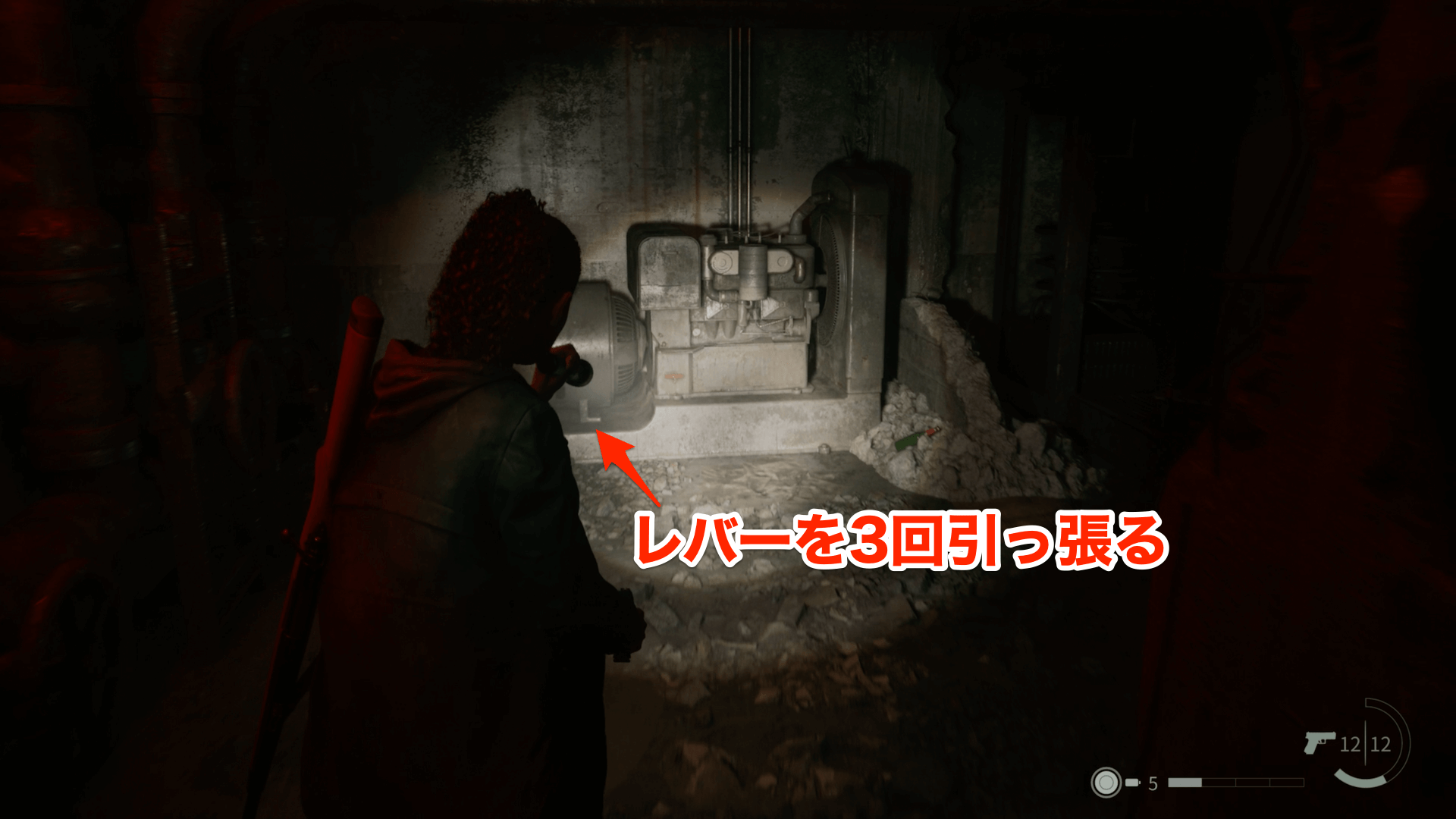 発電機 レバー レバーに近づくと、サーガが電力が必要と発言する。近くにある発電機のレバーを3回引っ張り発電させた後、レバーを上げて電力を復旧しよう。電力が復旧すると、周辺の壁が消えて扉が出現し奥に進めるようになる。