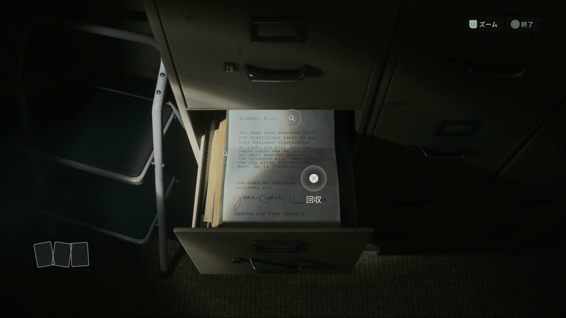 屋敷では、「樹木の教団」と「現実とフィクション」の事件の手がかりも入手可能だ。アンダーソン兄弟と並行して、手がかりをボードに整理しておこう。