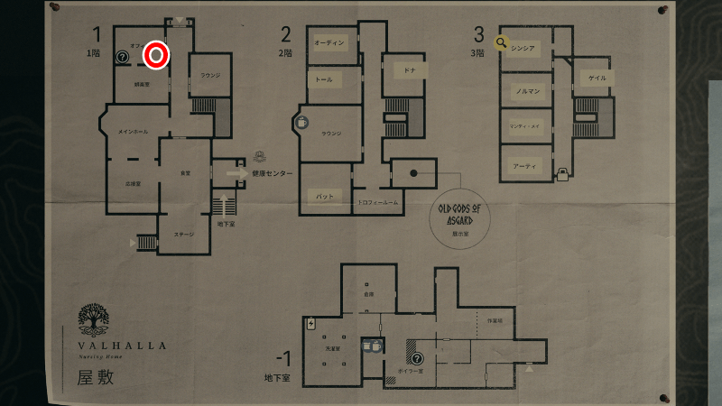 マップ マップ周辺画像 ノルマンたちとの会話の後、屋敷入口すぐの部屋に入ると老人ホーム・ヴァルハラのマップを入手可能だ。屋敷内を進む前にオフィスに立ち寄って、必ずマップを入手しておこう。また、マップ入手時に、オフィスやラウンジ、廊下を探索しておくと良い。