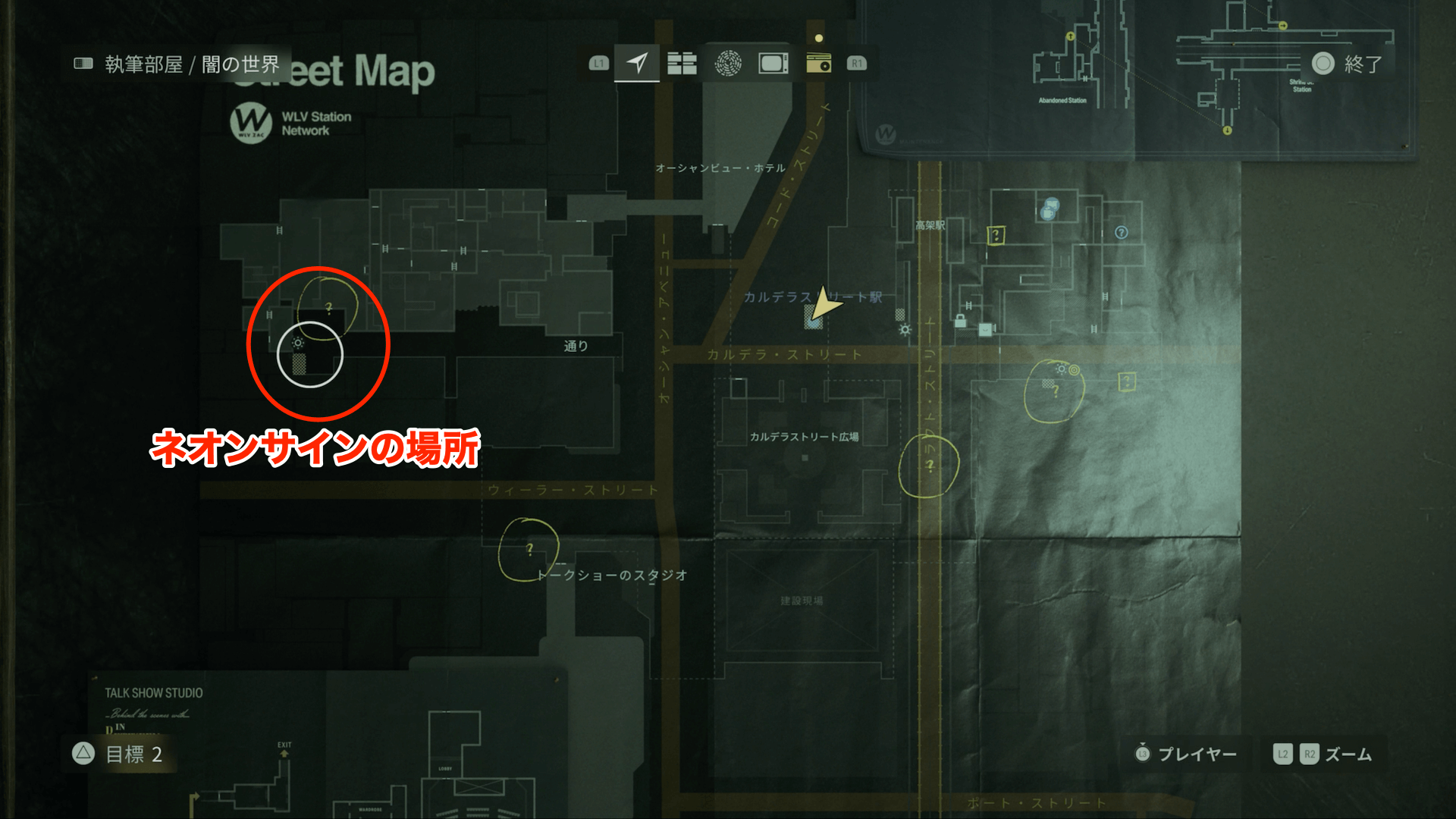 マップ 周辺画像 オーシャンビュー・ホテルに入ろうとすると、2枚目の扉を開く際に通りに戻されてしまう。電話の指示を推測して、通りの最奥にある「ミラー峠のネオンサイン」をに向かって進もう。通りを奥まで進むと、ケイシーとイベントが発生する。