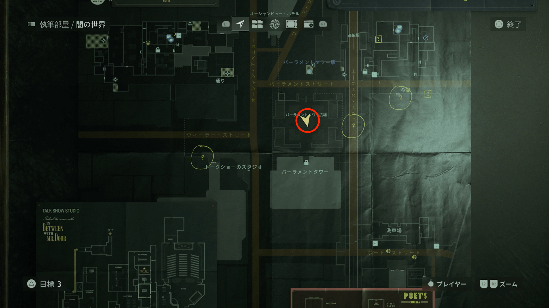 マップ 周辺画像 電話の指示の通り、パーラメントタワー広場にある像の下へ向かおう。像の足元に靴箱があり、靴箱に写真を入れるとパーラメントタワーの扉が開き入れるようになる。