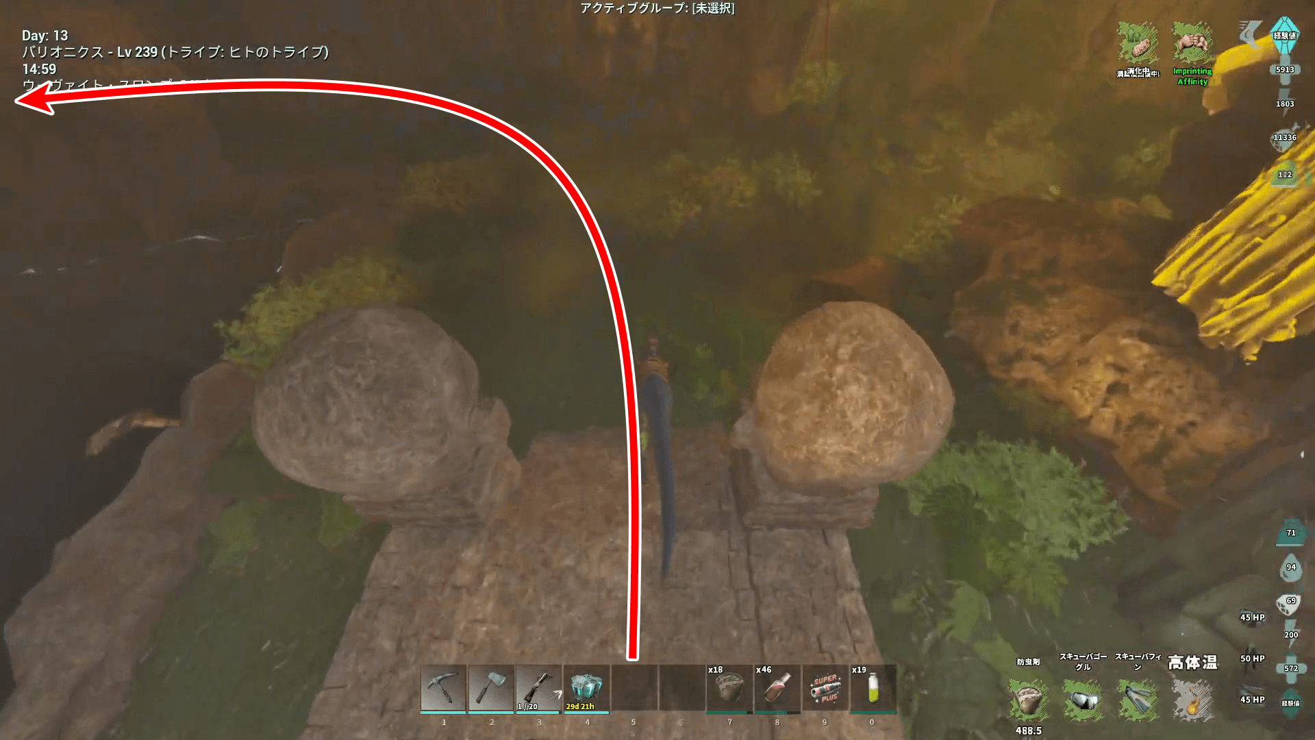 少しの水を潜るがバリオニクスは通行不可能。通り抜けたらペットを出す。