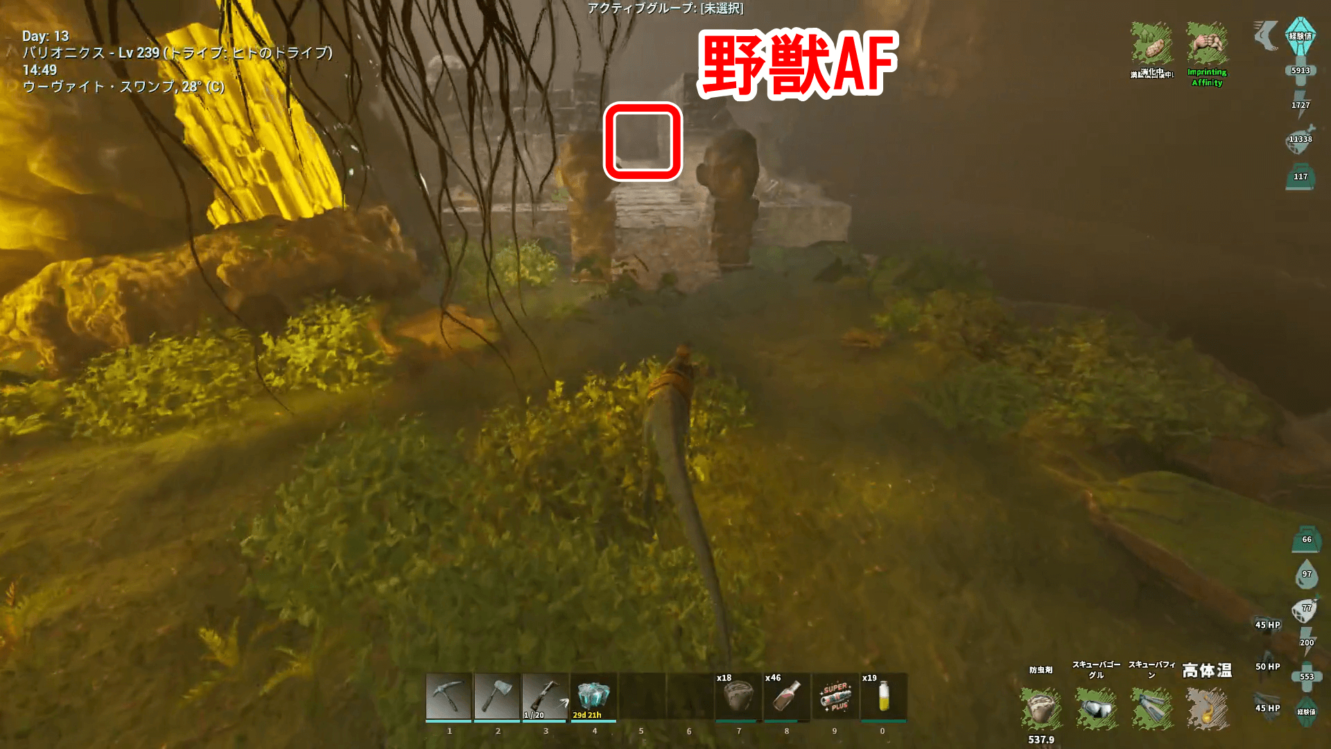 | 2025年10月24日現在、不具合で野獣のAFが回収できない可能性があります。AFは無いけど音は聞こえる…という場合は地面に埋まっているため、「ghost」コマンドで回収が可能です。戻るときは「walk」コマンド。 |