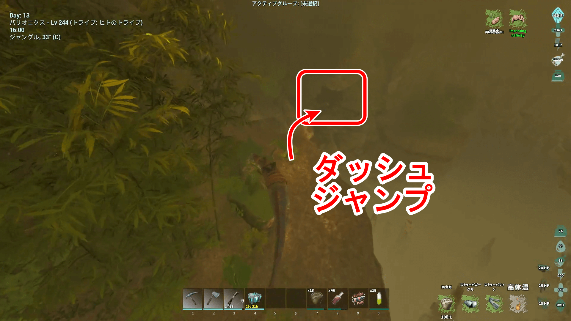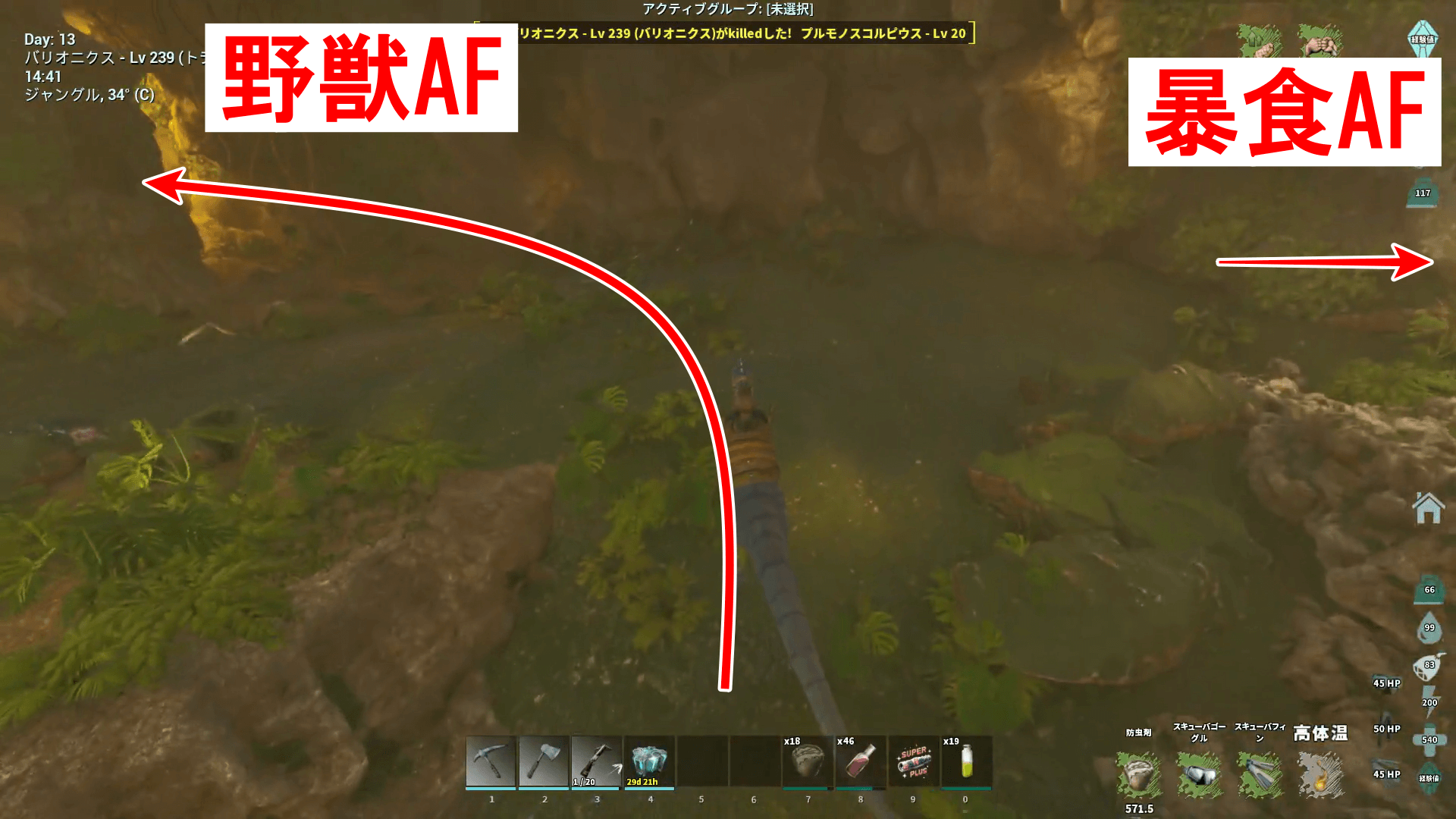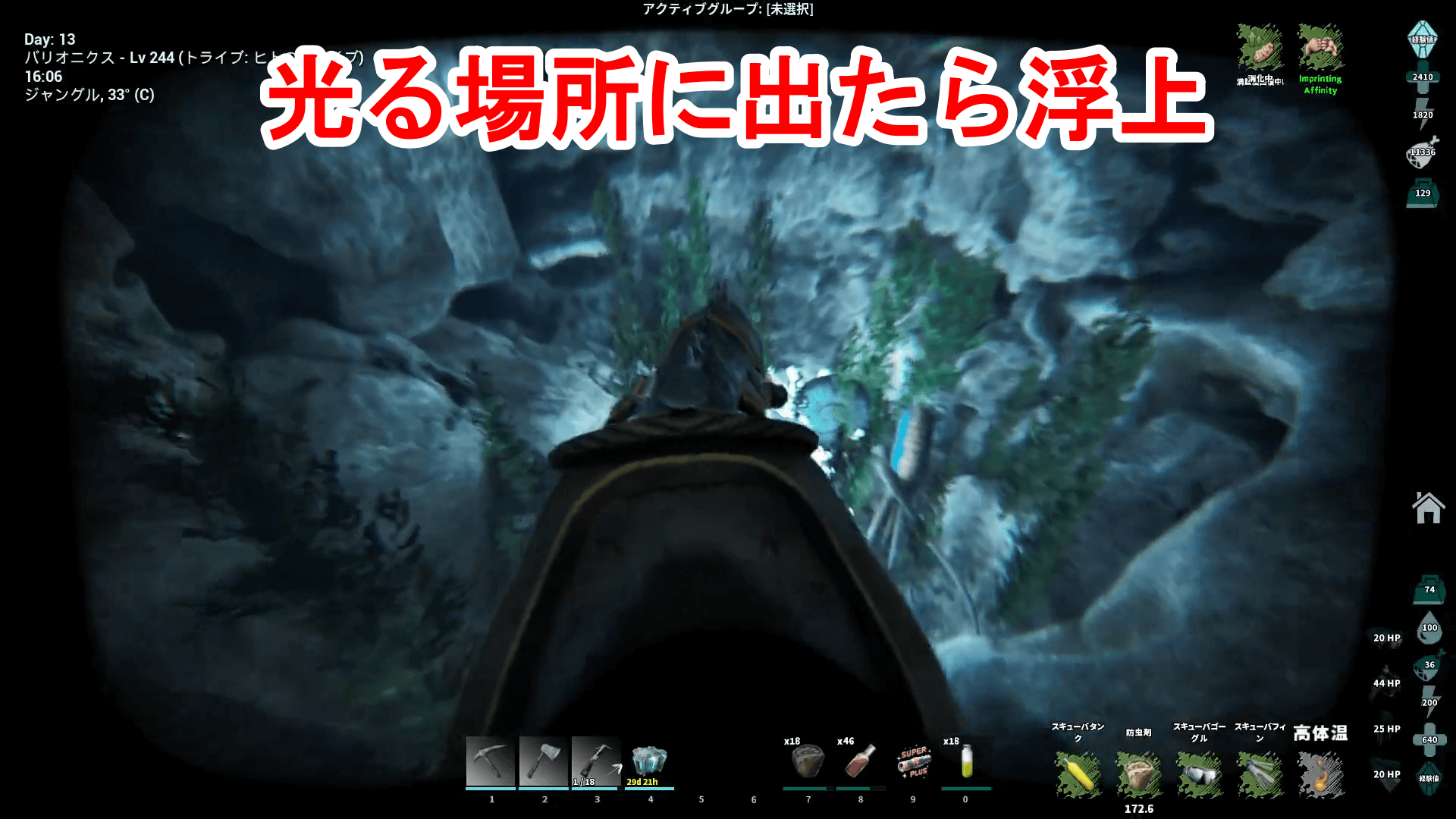 分かりづらい、浮上しづらい場合はペットから降りてサバイバー単身でもOK。ウミサソリが中にいるため、潜りすぎないように注意する。