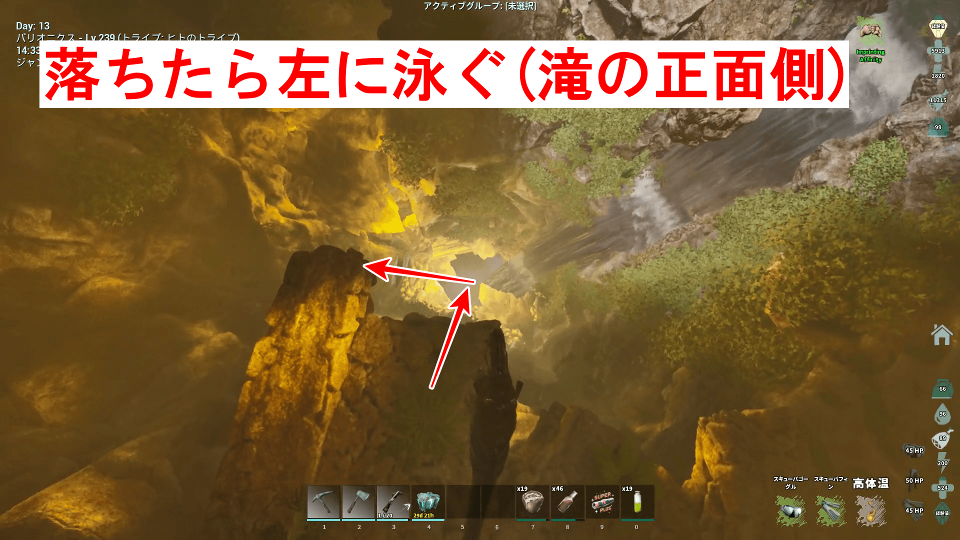 左側から迂回するように水に入り、潜りキーだけを押しながらだと進みやすい。