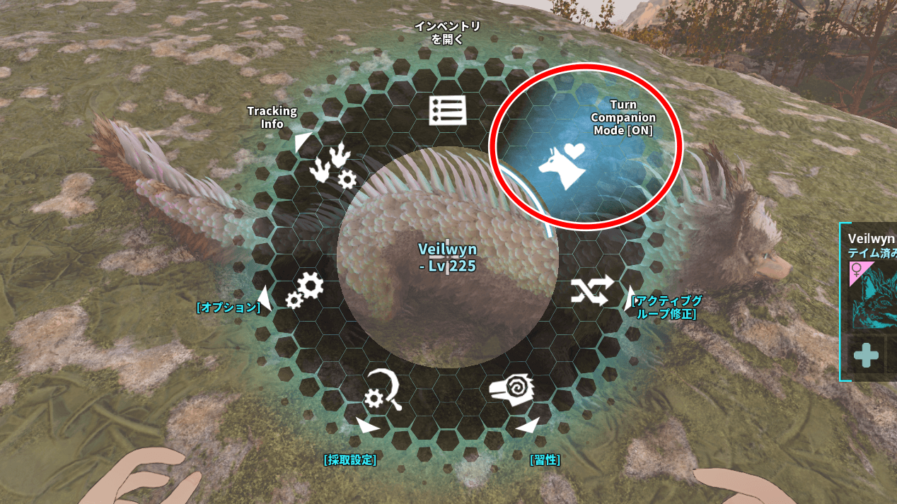 ソルウィンはベールウィンを進化させて入手する生物で、野生個体のテイムは不可能。まずはベールウィンをテイムして、コンパニオンモードにしよう。